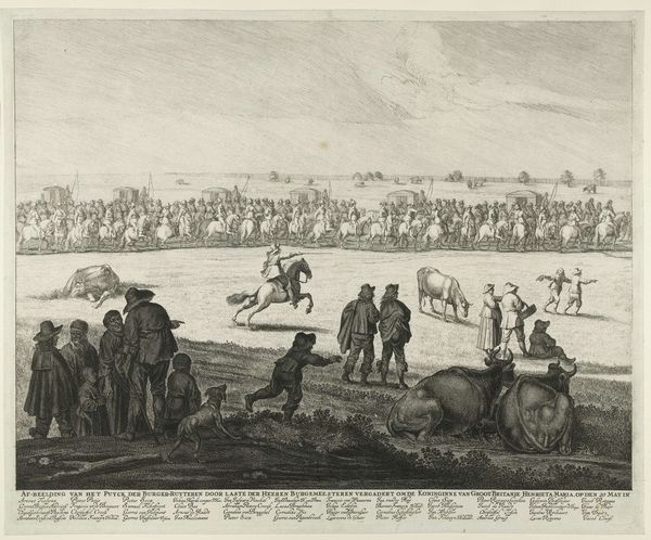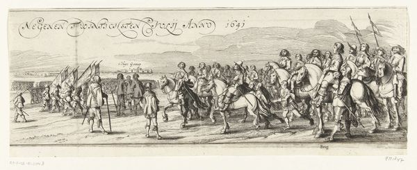 Editor: This is Pieter Nolpe's "Procession of the Civic Guard along the Haarlemmertrekvaart on the Occasion of the Entry of Queen Henrietta Maria into Amsterdam," created as an engraving in 1642. The detail is incredible, especially given the medium, but it also feels...documentarian, almost like a newsreel. What do you see in it? Curator: I see the intersection of labor, materials, and social function, plain as day. Look at the production: engraving, a repeatable medium, allows for wide dissemination of this event. Consider the labor involved, from the artist and engravers to the printers distributing these images for profit. Who consumed these prints and why? Were they collected as mementos, traded as commodities, or used to shore up political power? Editor: So, you're saying it’s less about the queen's arrival and more about the print itself as an object of its time? Curator: Precisely. And beyond its function as propaganda, look at the material reality. The paper itself, the ink used - what were the costs, and where did they originate? These details point to larger trade networks and economic systems at play. Was the paper locally sourced or imported, adding to the cost and reflecting the vast colonial reach of the Dutch at the time? Editor: I never really thought about where the materials *came from* for something like this. It definitely changes my perspective on how to interpret its value, especially the economic value for the society. Curator: Exactly! The lines are blurred between "high art" and the means of its making. Thinking this way connects the artistic moment to broader economic and even colonial histories. What happens when we see art as work? Editor: Food for thought, definitely. Thanks for broadening my understanding of what's "in" the picture. Curator: My pleasure. Material considerations help us better understand not just what the art depicts, but how and why it was created and consumed in the first place.