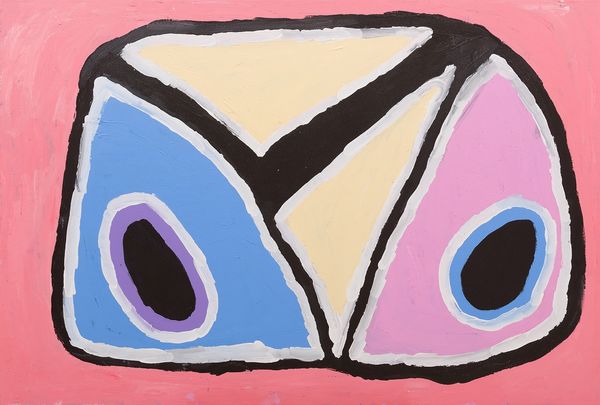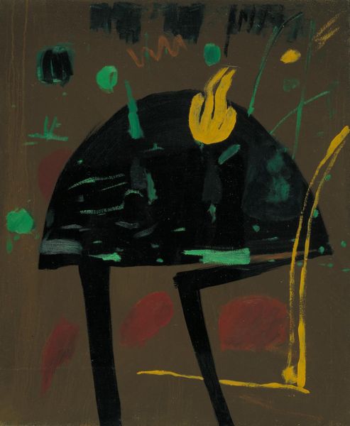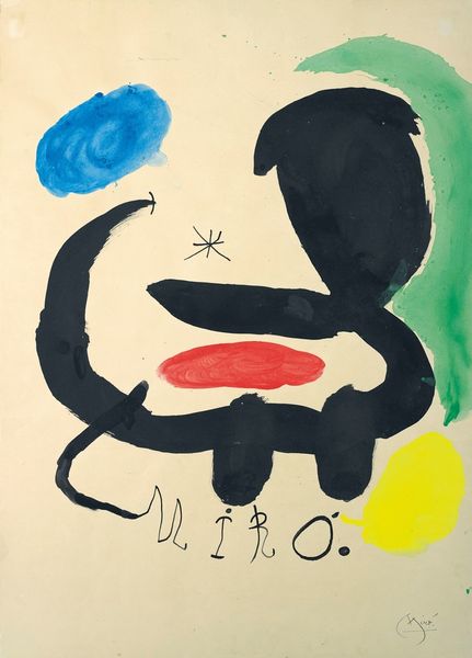 Curator: Let's discuss Joan Miró’s “Grand Palais,” a mixed-media print from 1974. I'm immediately struck by its monumentality, despite likely being on paper. The black form looms. Editor: Absolutely. The boldness of that central black shape, juxtaposed against the splattered background, suggests a kind of primal form. Its bulbous shapes and primary colors seem to tap into a very elemental visual language. Curator: Miró often worked across disciplines. Printmaking allowed for reproducibility, a democratizing aspect, offering accessibility to a broader audience. I wonder what kind of printing methods he used to achieve the textures we are looking at. It’s clearly more complex than a simple lithograph. Editor: And the shape itself - that dominates the frame. With its almost comical asymmetry and sparse details. I see eyes, or suggestions of eyes, rendered in red and yellow, along with horn-like appendages. Is this a deity, a grotesque animal, or pure abstracted form? It echoes figures found in many cultures across centuries, doesn’t it? Curator: It’s the suggestion of these recognizable forms – beak, eye – that prevent it from collapsing into complete abstraction. The labor involved in producing these prints is also of interest; each pulled print unique with slightly different textures, slightly varied applications of paint and medium. It becomes, in a way, a serial object with the mark of the artist's hand. Editor: I agree. He evokes a feeling of ancient glyphs and primal beings, but delivered through this lens of mid-century surrealism and abstraction. It speaks to a deep-seated human need to create totems and representations, a universal language seen across millennia. Curator: Examining the social context, it would be intriguing to investigate what the "Grand Palais" represents in Miro’s universe during the 1970s and its commentary in the society. Editor: Yes, and perhaps how it invited a contemporary audience to consider art's roots and the power of simple symbolic expression. Thank you! Curator: A potent thought. Thank you, indeed!