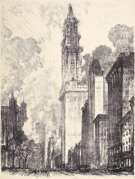 Joseph Pennell made this print of the Woolworth Building with etching, using lines to capture the textures of the city. The whole thing has an interesting open quality – you can almost feel the air moving through it. Pennell’s print is really about mark making and the feeling of the ink on paper. The texture is a bit dry, not lush, but it gives the image a kind of starkness that I like. Look at the way he uses hatching to create depth. See how those marks around the top of the building become softer, more atmospheric? It’s a beautiful way of showing how a massive structure like this interacts with the sky. This piece reminds me a bit of Piranesi, with the scale and the way he captures the grandeur, but Pennell brings a distinctly American sensibility to it. Both artists embrace ambiguity, allowing the image to suggest multiple interpretations.