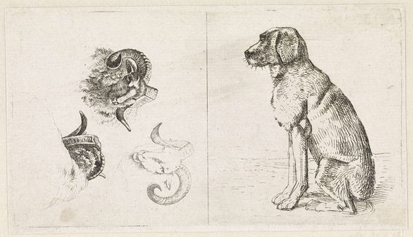 Curator: It's as though I've stumbled into someone's wonderfully peculiar dream. The first thing that struck me was the lanky, almost spectral hound on the top left – what a beautifully melancholic air! Editor: Indeed. What you're seeing here is a drawing rendered in pen, pencil, and ink, titled *Honden en een man leunend op een tafel met een kroes in de hand*, which translates to *Dogs and a Man Leaning on a Table with a Mug in his Hand*. It was created sometime between 1864 and 1880 and is currently held at the Rijksmuseum. The artist, Johannes Tavenraat, captured quite a social dynamic here. Curator: "Social dynamic," you say? I see a quiet contemplation. The slumped figure with a mug looks entirely alone, almost comically isolated by his gigantic hat and sorrowful expression. He appears completely removed from those rather scruffy looking canines. It speaks to a broader feeling of…alienation. Don’t you think? Editor: Perhaps, or consider the context of 19th century genre-painting. Tavenraat uses animal companions to explore class anxieties of the time. This feels especially pertinent when the ‘Man’ looks as though he’s on the lower rungs of society. I wonder if it highlights dependency on such animalistic comfort, for a downtrodden segment of society? Curator: Dependency, perhaps; it does give us pause when we consider our reliance on anything, material or emotional! There's a rawness in the sketches, a refusal to prettify the reality of the scene, which resonates deeply. And technically, I admire Tavenraat’s freedom and how he uses his lines – jagged, expressive…almost brutal! I can practically feel the chill in the air. Editor: The looseness absolutely contributes to its overall impact. The quick, almost frantic marks communicate urgency, and, arguably, highlight some difficult questions. Is it a romanticisation of rural life, or is it exposing an uncomfortable dependency? I'm not certain that Tavenraat offers any clear answers. Curator: Leaving us with only a beguiling invitation to ask the questions ourselves? Splendid! Editor: Precisely. And in confronting these social and existential themes, Tavenraat encourages viewers to interrogate their preconceptions surrounding human, animal, and class divides. A truly enduring sketch, that's as poignant as it is deceptively simple.