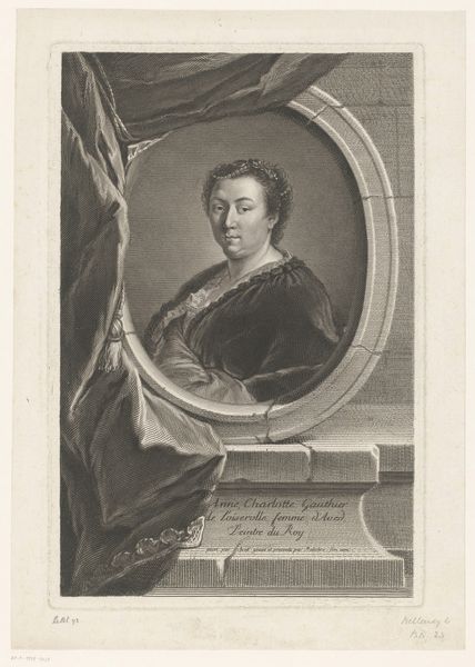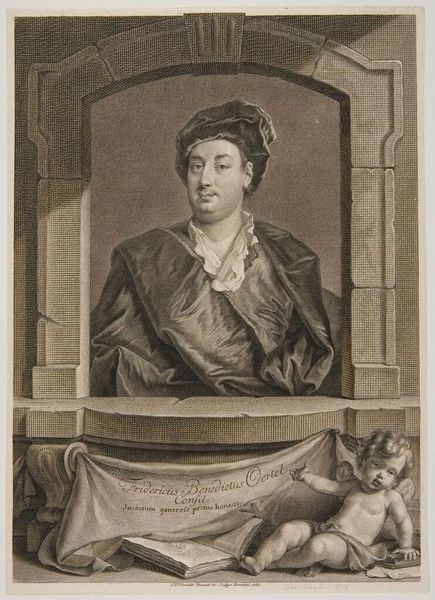 Curator: Here we have Georg Friedrich Schmidt's "Portret van Friedrich Benedikt Oertel" from 1752. The artwork, held at the Rijksmuseum, is an engraving. What strikes you initially about it? Editor: There's a formality, definitely, but the little cherub brings in a counterpoint of…playfulness? It's a study in contrasts. The engraving gives a sepulchral air to the magistrate shown. The baby looks alive and kicking, with a hint of mockery, and the effect is a mixed feeling toward this bewigged fellow. Curator: Absolutely, I find the juxtaposition fascinating. The architectural setting almost transforms Oertel into a sculpted bust. He appears staged and static, while the cherub has his scroll and book at his side, drawing the eye to that banner with the dedication written in Latin script. Editor: That division reinforces social power structures of the era. Oertel's portrait as an individual with importance enshrined within the rigid structures versus the cherub signifying the divine, a symbolic validation. It speaks to how individuals of stature wanted to be perceived, as connected both to earthly power and divine authority. Curator: The selection of engraving also bears significance. Etchings were widely regarded as an artisanal method of graphic reproduction and conferred legitimacy at the time to the people, books, images, maps, and documents represented through them. Editor: I agree, printmaking in this context allowed for broader dissemination and helped propagate particular ideologies and imagery of leadership. Who got to be shown this way, how were they framed, and who paid for these prints shaped public perception and memory. And here is the cherub pointing the gaze to the banner with his name. It’s another trick for eternity. Curator: It’s a complex web of signs, symbols, and techniques working together. Thank you for drawing out so many layers within what may, at first glance, seem like a conventional portrait. Editor: Thanks for your insightful reading, I am more alert now to the hidden messages conveyed in this type of official depiction!