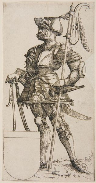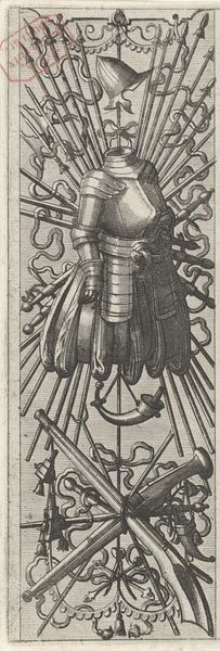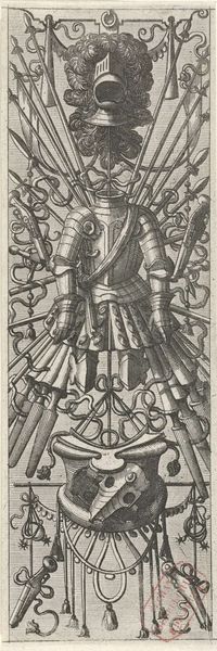 Editor: So, this is "Vlakdecoratie, bestaande uit een wapentrofee," made between 1558 and 1572 by Johannes or Lucas van Doetechum. It’s an engraving, currently at the Rijksmuseum. There's this... organized chaos to it, this dense layering of weapons and armor. What narratives or histories do you see embedded in this piece? Curator: That's a keen observation about the organized chaos. I see it as a visual representation of power, but also vulnerability. The assembled weaponry speaks of military might and dominance. But consider the period. These trophy arrangements were often commissioned to commemorate victories, but who benefitted and who suffered? Were these trophies truly celebratory for all members of society? Editor: I hadn’t thought about that! The flip side to victory, the conquered and displaced. So, the artist is making a statement about the complexities of power? Curator: Perhaps not overtly, but we can certainly read it that way now. The image serves as a potent reminder that history is never monolithic. During the Renaissance, rising empires employed art to validate, strengthen, and communicate their message. The artist shows the military paraphernalia – breastplates, guns, lances, and drums - yet those weapons imply control and forced allegiance. This makes us reflect on the role of art as not just decorative, but ideological. What do you think? Does the context change your view of the artwork? Editor: Absolutely. The trophy of arms, on the surface seems purely celebratory. Thinking about its function, or *intended* function, versus its real-world implications of violence, completely changes the way I see it. I was focused on the artistic aspects and how impressive it looked, but it does feel like I missed a darker point. Curator: Exactly. By acknowledging these dualities we avoid complicity in art’s possible role as propaganda. Always keep asking: Who is included in the narrative, and who is erased? That will greatly affect your experience of the artwork.