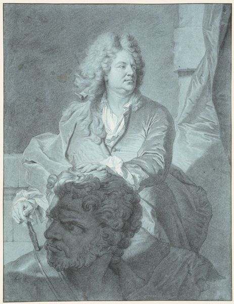 Gilles Allou created this drawing of 'The Sculptor Antoine Coysevox' using pen and brown ink with watercolor and white gouache. The image is structured around contrasting textures and tonalities. Note how the solid dark background contrasts with the light catching the wig, face and drapery. The sculptor’s gaze leads us to a faint sculpture in the background; this directional cue adds depth and complexity to the composition. The drawing can be interpreted through semiotics, where gestures, clothing, and artistic tools function as signs. Coysevox pointing directs our attention, and his attire and tools represent his status and profession. This creates a visual narrative that invites us to decipher the sculptor’s identity and cultural role within 18th-century French society. The intentional use of light and shadow, combined with symbolic gestures and artistic tools, transforms a simple portrait into a nuanced reflection on art, identity, and cultural representation.