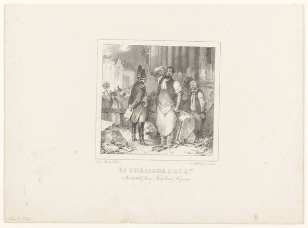 Curator: Oh, isn't that captivating? The light, the story hanging in the air… Jean-Baptiste Madou made this lithograph, "Interieur met gezelschap luisterend naar het verhaal van een ridder," sometime between 1835 and 1837. Editor: It definitely has that hushed quality. Everyone's so engrossed. You get a real sense of theatricality even though it’s just…a print. It feels like looking in on a clandestine moment in history, staged just for us. Curator: Staged history, I like that! Genre paintings like these became popular in the 19th century as a way to depict everyday life, albeit often idealized. It’s interesting to see how Madou’s tapping into Romanticism's love of narrative and folklore. Editor: Absolutely! It’s also clearly selling a particular vision of domestic life, one where leisure and entertainment revolved around these kind of storytellings, performative displays of wit and wisdom within an interior. Are we really to believe there were no chores waiting for anyone here? I find the implicit class aspect in these sorts of pieces particularly telling. Curator: That’s so true. It definitely paints a picture, doesn't it, of a very particular social stratum with time and resources to…just listen. And look at the body language of the central character. Total performance. Every gesture calculated. You see the desire for a more expressive and emotional world emerging here through drama and rhetoric, something history tells me that only a certain class was actually granted to explore. Editor: You can even see it in the detailing—the shadows in the room are playing around each listener to heighten our senses— the folds of their costumes, it makes me imagine they’re rustling like fall leaves caught in the wind. How would you describe the distribution and source of light across the work? Curator: It does feel rather poetic, and a little ominous actually. The light is certainly distributed in a manner which leads our eyes toward the "narrator", but it also sets a bit of a dramatic ambiance which makes the audience’s expressions very engaging too. A certain light is shed (no pun intended), even to the cute dog chilling in front. I notice there aren’t many women depicted. It does feel to me that in the face of an interior setting which is perceived to be feminine in its qualities, this image places narrative in a clearly male-dominant manner. Editor: It’s all storytelling, from Madou's composition to the knight's performance. And even beyond the confines of the paper itself— the story extends to us as the audience! It reminds me we’re still caught in the echoes of these narratives today. Curator: Yes, absolutely. I’m going to listen more attentively to whoever starts the next story I encounter, to whom and where, in which light is told... who knows, maybe I'll pick up something invaluable!