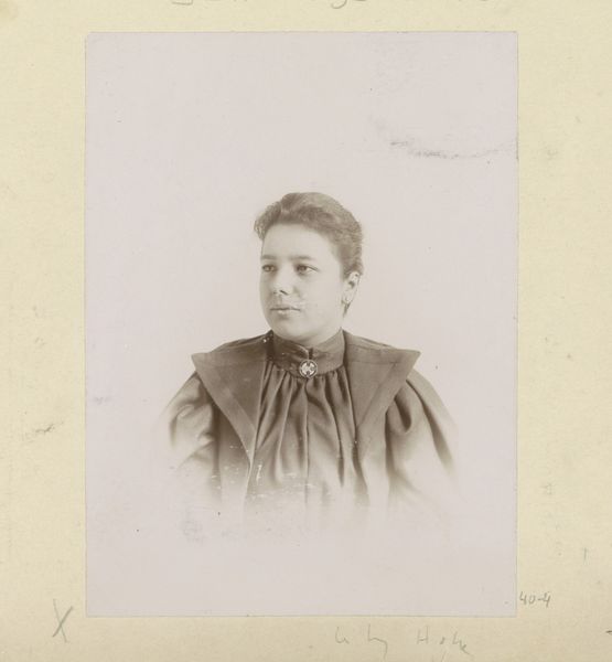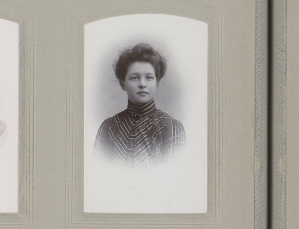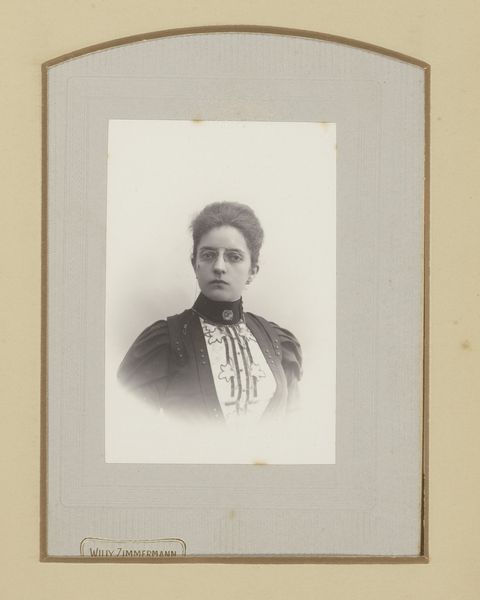This is a portrait of a young woman with glasses, made by Machiel Hendricus Laddé, using photography. Photography in the 19th century was a relatively new medium and involved a complex chemical process. Each image required careful preparation of the light-sensitive materials, precise timing during exposure, and skilled development techniques to reveal the final picture. The sepia tone of this print, achieved through chemical treatments, would have been a popular aesthetic choice. The mount around the photograph is also significant. These mounts, often mass-produced with decorative borders, framed the image and elevated it to an object of display and commerce. This portrait offers a glimpse into the democratization of image-making. Compared to painted portraits, which were exclusive to the wealthy, photographic portraits made it possible for a wider range of people to document their likeness and participate in visual culture. It is an early instance of the kind of image saturation we live with today. Looking closely at the materials and processes behind this photograph allows us to appreciate how technology transformed artistic expression, and to consider its broader implications for society.