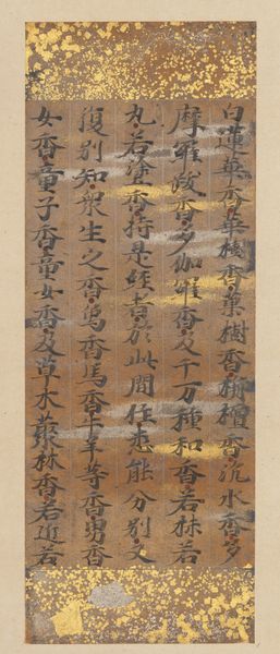 Curator: At first glance, this work appears subdued, almost minimal. I’m immediately drawn to the textural qualities of the aged paper and the gestural freedom in the brushstrokes. What are your first thoughts? Editor: I am immediately aware of how the weight of language and power dynamics operate in this historical artifact. We must remember the context of who made these marks, and for whom. Curator: Precisely. We are looking at a pair of waka tanzaku, vertical poem cards, created sometime between the late 16th and early 17th centuries. They were rendered in ink on paper by Konoe Nobutada, a prominent courtier and calligrapher. These exquisite cards are now part of the collection at the Minneapolis Institute of Art. Editor: As we observe these forms, we also have to deconstruct them, acknowledging their place within rigid court structures. How did Nobutada navigate and perhaps subtly critique those societal expectations through his art? What social codes are embedded in these brushstrokes? Curator: Absolutely, those are essential considerations. Nobutada's calligraphy was highly regarded, influencing many subsequent artists. What I find remarkable is how he synthesizes Chinese calligraphic principles with Japanese aesthetics in this period. Editor: And it’s critical that we consider the function and dissemination of art. The elite enjoyed exclusive access to art and its interpretation, reinforcing existing power structures. These cards are not just pretty artifacts. Curator: I agree, and yet, one could argue that through the sharing and gifting of art and poems a degree of intimacy and connection emerged within the confines of the Imperial court. Editor: Yes, there can be interpersonal meaning and commentary embedded within this highly controlled structure of life at the imperial court. Curator: Thinking about Nobutada and these "Two Waka Tanzaku", it brings up so much concerning social status and artistic conventions. Editor: Indeed. Reflecting on the weight and importance of objects helps reveal to the viewer both a lens into the past as well as today.