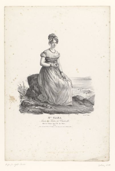 Editor: This is Alexandre-Marie Colin's "Portret van Mademoiselle Mante als Rosine in Le Barbier de Séville" made between 1823 and 1824 using pen and drawing on paper. The woman's posture and the overall monochrome feel make the portrait appear rather demure. How do you interpret this work, especially considering its context? Curator: The portrait speaks volumes about the performance of gender and class in 19th-century French society. Mademoiselle Mante, depicted in character, is framed within the rigid expectations of her time, both as a woman and as a performer. Notice how the constraints of her dress—the tight bodice, the voluminous skirt—mirror the societal constraints placed upon her. What do you think her role as Rosine, a character known for her wit and defiance, might suggest about Mante's own position and agency? Editor: That's a great point. The costume, while restrictive, is also a statement of identity within a theatrical context, possibly indicating a subtle rebellion against those same constraints? Curator: Precisely! Think of Romanticism as a movement. It's deeply invested in ideas of individual expression, yet that expression is invariably filtered through societal norms, particularly for women. The 'genre painting' aspect also pushes us to consider how women's identities were often represented through very specific narratives. The opera itself – 'The Barber of Seville' – offers a commentary on social mobility. Editor: It is as if Mlle. Mante is subtly engaging with social expectations of the time by taking on a very visible role, making the audience question where performance ends and her own agency begins. I had not initially perceived it that way. Thank you for your enlightening interpretation. Curator: My pleasure. Thinking about the artwork's connection with the socio-historical setting helps us engage with its artistic narrative in a way that feels so very real.