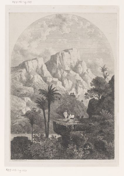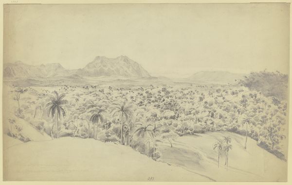 Curator: Here we have Eugène Flandin’s “Ruïnes van Bishapur,” a drawing executed between 1843 and 1854, rendered in ink on paper. Editor: What a fascinating interplay of desolation and serenity. The crumbling architecture evokes a palpable sense of history, yet the landscape emanates such peace. Curator: It certainly captures a specific historical and cultural moment. Flandin, a French Orientalist painter, was part of a diplomatic mission to Persia during the reign of Mohammad Shah Qajar. These visual records, like this one, served to document and, in many ways, claim knowledge of these distant lands for a European audience. Editor: The ruined structures really speak to me. That domed structure, for instance – even in decay, the archways and geometric patterns hint at a sophisticated design. I’m drawn to how the palm trees, recurring motifs in such imagery, act as emblems of the exotic "Orient." Curator: Exactly. It is crucial to remember that this wasn't objective documentation. Images like these actively participated in shaping European perceptions of Persia and Islamic culture. Notice how the figures are positioned—almost as if staffage, picturesque elements in the foreground to emphasize the grandeur of the scene. Editor: And isn't that figure in the foreground so interesting? Robed and walking away from the viewer along the worn path? A symbolic envoy, or maybe just another man making his way through the dunes. Curator: Or maybe just an impression of exoticness, not a person at all. We should be aware of how the Western gaze has historically interpreted and often misinterpreted these cultures. Art was being used as part of the project to explain Persia and Persia’s story to Europe, influencing political discourse. Editor: Absolutely. These visuals often served political and social purposes, reinforcing existing power structures, as much as conveying knowledge about distant lands. Curator: By engaging with this drawing critically, acknowledging its historical context, we can better understand not just the ruins of Bishapur but also the complex interplay between art, politics, and cultural representation. Editor: Indeed, it serves as a visual portal, inviting us to engage with both a landscape and the historical currents that shaped its portrayal.