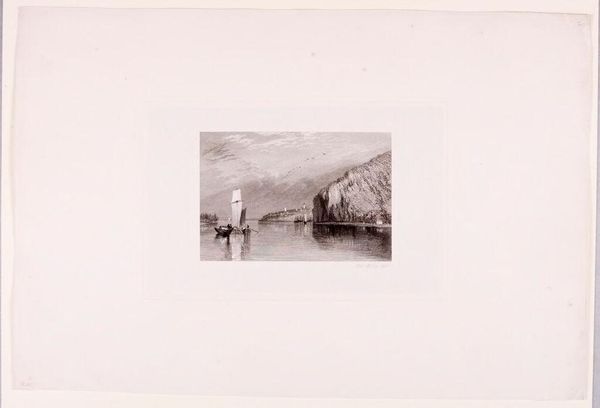 Editor: This is Robert Wallis's "Coteaux de Mauves." It depicts boats on what looks like a calm river, with a striking cliffside in the background. What strikes me is the focus on what feels like a serene, working waterfront. What do you see in this piece? Curator: It's interesting you notice the "working waterfront." Images like this were often commissioned and circulated to promote tourism and trade. Consider the picturesque elements: the quaint boats, the dramatic cliffs, and the implication of a quaint town just beyond. How does this image participate in shaping a specific narrative of place? Editor: So, it's not just a pretty picture, it's selling something – a lifestyle, maybe? It makes you wonder about the lives of the people in those boats, and how the image might romanticize their labor. Curator: Exactly! By understanding this, we can begin to deconstruct the power dynamics embedded within seemingly innocent landscape art. Something to keep in mind. Editor: That's a perspective I hadn't considered. Thanks!