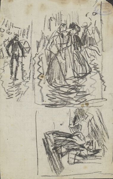 Editor: So, here we have George Hendrik Breitner's "Figuren op de Dam in Amsterdam," made with pencil and charcoal around 1893-1894. The hurried, sketch-like quality of it gives a sense of bustling movement, yet it's also somehow bleak and desolate. What do you see in this piece, in terms of what it might be trying to tell us? Curator: It’s fascinating how Breitner captures the Dam. Beyond the immediacy, I'm drawn to the deeper currents flowing beneath the surface. Think of the Dam as Amsterdam’s symbolic heart. A space for gatherings, announcements, executions. The rapid strokes become more than impressionistic technique. Doesn’t the artist employ almost shorthand figures, evoking a collective memory, a palimpsest of countless untold stories imprinted onto the very ground? What emotions do those almost ghostly figures evoke? Editor: I get a sense of transience, like they’re ghosts passing through. Curator: Exactly. But think further – perhaps those aren’t simply ghosts of people long gone but figures representative of *types* within society. See the downward tilt of the central figure's head, perhaps hinting at the burden and difficulties for this group of society’s rapidly modernising culture. This image seems less about portraying reality directly than about filtering collective experience through a specific visual language, loaded with symbolic implications, don’t you agree? Editor: I hadn't considered the weight of historical context on how we read even seemingly simple impressionistic works, but you’re right; the history imbues the image. Curator: And those simple strokes hold layers of social meaning. The artist is speaking in visual symbols, continuing a dialogue across time. Editor: That's really interesting. I'll definitely look at other Impressionist cityscapes with a new awareness of the symbols at play. Thank you.