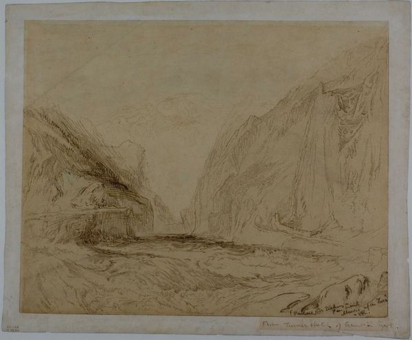 Editor: Here we have Maria Vos's "Village at the Foot of a Mountain, Probably on the Rhine," a pencil and pen sketch from about 1860-1865. It feels…peaceful, almost ethereal, like a half-remembered dream. What do you see in this piece? Curator: The mountain, of course, looms large. It dwarfs the village, becoming a symbol of nature's enduring power against the transient works of humanity. Note how the artist captures not just the physical form but the feeling of the place. Mountains often carry complex cultural significance, don't they? Editor: They do, yeah! Strength, stability, sometimes even the dwelling place of gods, right? The houses below seem almost…vulnerable? Curator: Precisely. And what about the water? Do you see the thin line that signifies a river or a large body of water? Editor: Now that you mention it, the water does seem almost like a mirror reflecting the mountain’s image, but in a much more fleeting way than, say, the rock itself. Maybe the impermanence of life? Curator: A keen observation. Consider, also, the tradition of landscape painting. It’s rooted in Romanticism – a search for sublime experiences, that powerful and fearful, awe-inspiring sensation. Does Vos's landscape evoke any of that for you? Editor: I can see that. While delicate, the mountain still has that weight, doesn't it? That grandeur makes the viewer feel small but in a strangely good way. Curator: It's an interesting interplay. It brings up themes of how we, as humans, are related to a higher force in the universe, right? Vos hints at cultural memory and continuity by creating the contrast. Editor: It's amazing how much symbolism can be packed into a simple sketch. I will certainly look at landscapes differently now! Curator: Indeed. There's always a narrative woven into what we see.