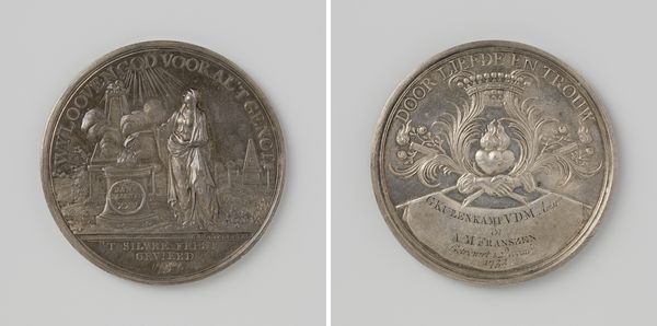 Editor: Here we have "Departure of Baron Van Imhoff, Governor of the Dutch East Indies, 1742," a metal relief engraving by Martin Holtzhey. The silvery texture makes me think of wealth and status. How would you interpret this work, especially given its historical context? Curator: Well, it’s fascinating how this coin, or medal, tries to create cultural memory. It’s not just about recording an event, but about shaping its meaning for future generations. The baron's portrait connects him to the great rulers of the past. And on the other side, that scene – do you notice how Van Imhoff is depicted offering something to a seated female figure? Editor: Yes, almost like a presentation. Curator: Precisely. And what symbols do you observe? Ships indicate voyage or colonization, and the woman could signify the Dutch East Indies, receiving his… patronage. It's a visual argument for the benefits of Dutch governance, isn't it? What about the figures in the background? Editor: They look like classical figures, possibly allegorical representations of the East Indies. But is it that simple? The indigenous people do not appear to be a primary aspect of the depiction. Curator: Ah, that tension is the most potent element of colonial iconography, right? It is an attempt to create and promote cultural values through visual propaganda. What do you think this says about cultural memory versus actual historical experiences? Editor: I now recognize how a coin or medal can be less a neutral record and more a strategic narrative device. Curator: Precisely. Recognizing these intended associations enriches our appreciation, prompting contemplation on cultural endurance and significance across time.
