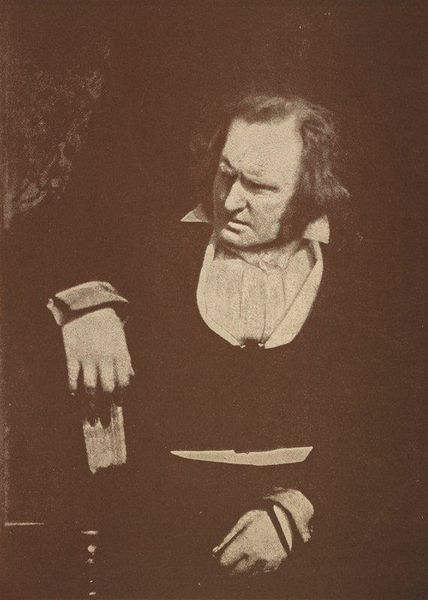 This undated calotype of Professor John Wilson by Hill and Adamson is characterized by its textured surface and tonal range, which give the image a painterly quality despite its photographic origin. The composition is dominated by the sitter's figure, arranged in a thoughtful pose that directs our attention to the expressiveness of his face and hands. The sepia tones and soft focus lend the image a sense of intimacy, while the strategic use of light and shadow models Wilson’s features. The photograph uses the semiotic system of signs where the subject's posture and gaze act as cultural codes which allow the viewer to interpret the subject's disposition. The image's materiality – the palpable grain of the paper and the subtle variations in tone – enhance its sense of authenticity. This calotype represents a fascinating intersection of art and science. It challenges fixed notions of portraiture and explores new ways of thinking about representation. The formal qualities of the work invite ongoing interpretation, illustrating how early photographic practices engaged with broader artistic and philosophical concerns.