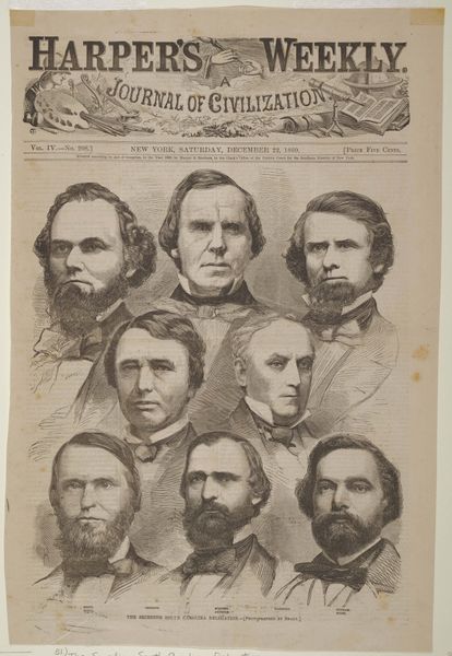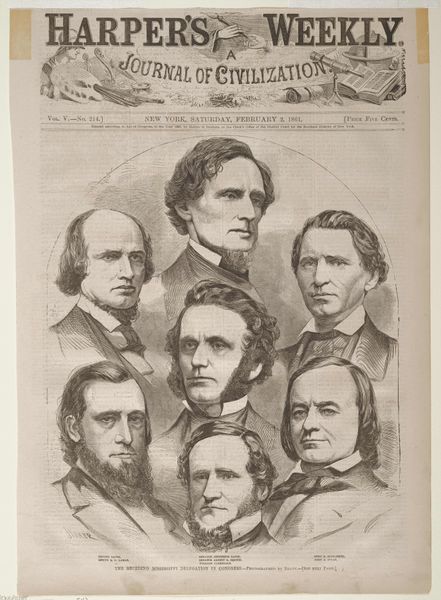 Curator: This etching, titled "Danske og norske forfattere," dating back to 1868, is an assembly of portraits by Julius Magnus-Petersen currently held at the SMK, the National Gallery of Denmark. Editor: What strikes me first is how the sharp, almost severe lines of the portraits are softened by the decorative floral border—a peculiar duality of rigor and romanticism. Curator: I think this says a lot about printmaking at the time; it was a mass production of a commodity. The artist aimed to capture these authors' likeness and bring them to the masses who would buy and consume this imagery, in a new kind of image market, right? Editor: Undeniably, and each portrait is framed similarly, yet individuality persists through posture, expression, and beard styles! Curator: It's fascinating to see how etching could both standardize representation while permitting glimpses into the social standing of these literary figures through subtle differences in attire and grooming. Look at the material conditions around each of the authors, like perhaps the quality of the paper they write on, or the patronage that gave them access to create without worrying about funding. Editor: From a formal perspective, the composition's balance is superb. Petersen's use of cross-hatching builds both form and atmosphere—note the subtle gradients around their faces giving each one a distinguished appearance. Curator: And it is interesting, though, to think about whose voices and images are collected here, while the hands of labor are erased and overlooked. How do you see those absences impacting your analysis of this piece? Editor: Precisely; those absences remind us to question art's representational power—who holds it, who’s included, who’s excluded, and the aesthetic consequences. Curator: Looking at Petersen’s work today really encourages me to think about who’s producing, who gets promoted and archived and sold in our institutions now. What structures are enabling or inhibiting diverse artists to produce and sell in art markets? Editor: A beautiful point. Thank you for framing our aesthetic appreciation within a material and social consciousness, it's something to consider beyond the immediate impact.