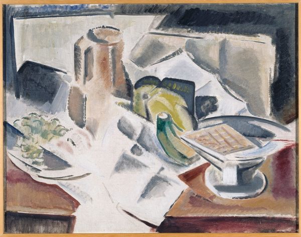 Curator: We're looking at Renato Guttuso's "Interno," painted in 1948 using oil on canvas. What's your immediate reaction to it? Editor: It strikes me as a composition of confined tension, yet pierced by an outside light. The colors are muted, save that jarring blue curtain and vibrant window view. It feels emotionally charged, maybe claustrophobic. Curator: Guttuso was working during a period of immense social upheaval in Italy. Consider the materiality – the thickness of the impasto, the deliberate brushstrokes. The postwar atmosphere fostered a renewed focus on Realism. Editor: Indeed. Even in this simplified still-life, I see that echoed. The radiator speaks of survival; a somber witness to the space, and the bottle. Is that wine or medicine? Are we observing refuge, maybe even resilience after trauma? Curator: It could be interpreted as such. Guttuso was part of the Fronte Nuovo delle Arti which explored similar subject matter, using abstraction to capture the unease of post-war society. Editor: Let's look at these stark contrasts and arrangements. The painting seems almost constructed—a table laden with everyday items: bottles, glass, a figure. Is this then a portrait, perhaps symbolic, not simply a still life study? Curator: Perhaps it blends both, reflecting his deep investment in socio-political themes. The layering suggests he reworked this painting with intense care and physical effort, suggesting labor. His post-impressionist leaning in style would definitely lean towards a figurative, symbolic one as opposed to an empirical and impressionist vision. Editor: Yes. The placement of the items upon the table become not simply placement but symbolic language to be decoded. Look at that drape and that blue curtain! Together they indicate mourning; the bottle of wine or perhaps other spirits further accentuating despair. There is an echo of mortality here. Curator: Fascinating insight. In thinking about his approach to the materials and how he uses them, there’s a deliberate attempt to use modest means to reflect the lives and surroundings of everyday people. Editor: The artist leaves so many visual cues embedded in domestic objects for us to ponder life beyond what the object can readily offer as something purely functional or material. Curator: A testament to how artists can use even the simplest things, transformed on canvas, to capture complex and challenging emotions from complex times. Editor: Agreed. Art truly reflects its time!