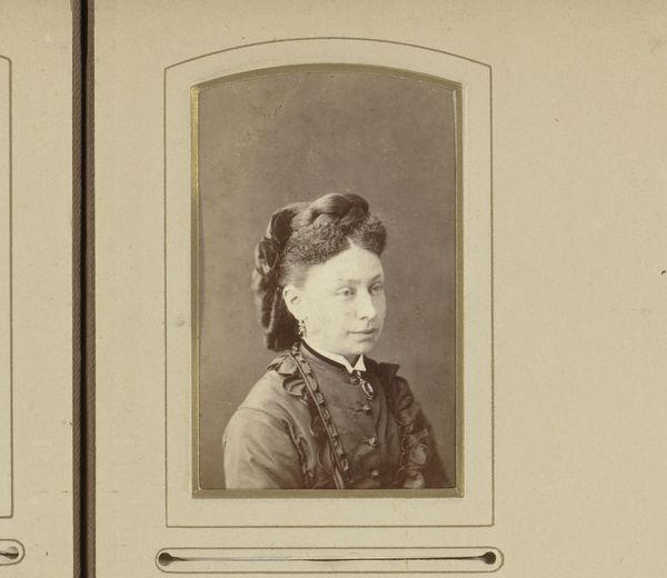 Editor: Here we have "Portrait of a Young Woman," made sometime between 1861 and 1887, an albumen print by Albert Greiner, currently residing at the Rijksmuseum. I’m immediately drawn to the soft lighting and how it contributes to the photograph's almost dreamlike quality. What strikes you when you look at this portrait? Curator: Initially, the nuanced interplay of light and shadow across her face commands attention. Note how the highlights define the contours, creating depth and volume. Consider, too, the geometric rigor underlying the composition – the subtle framing within the frame. Do you observe how the rigid border enhances the gentle curves of her face? Editor: I see that, yes. It's like a contained elegance. How would you say the medium, the albumen print itself, contributes to this effect? Curator: The albumen process lends a distinct tonal range and surface texture. Observe the almost pearlescent quality, particularly in the highlights on her skin and hair. This tactile dimension adds a layer of visual complexity, inviting close scrutiny of its materiality. Consider also how photography at this time allowed for the reproduction of detail, a kind of mimesis, and compare it with paintings from that era. What distinctions can be observed in terms of capturing detail and form? Editor: So it’s not just what is depicted, but also how the printing technique and even framing play an essential role in the photograph's overall artistic impact? Curator: Precisely. By carefully attending to these formal properties, we begin to unlock its aesthetic richness. And how these forms and techniques define photographic portraiture as distinct from other kinds of visual art. Editor: That’s a perspective shift for me – thinking about a photograph not just as a picture but as a constructed arrangement of forms and techniques. Thank you! Curator: A valuable distinction to consider. Analyzing its structural components reveals the artwork’s intrinsic properties.