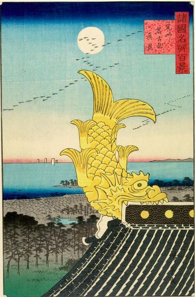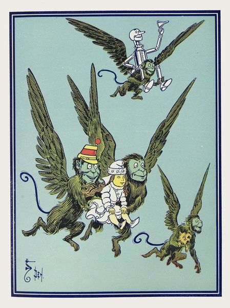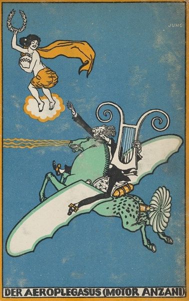Editor: Here we have "The Duke of Gramatneiss’s Famous Pack of Birds," a 1911 print by Moriz Jung, bursting with Art Nouveau charm. It’s whimsical, almost dreamlike, but there's also a slightly chaotic energy in the composition. What catches your eye in this rather unusual scene? Curator: Ah, Moriz Jung! This piece… it's like stepping into a wonderfully strange Viennese daydream. See how the airplanes mingle with flocks of cartoon-style birds? It's a world where technology and nature collide in the most absurdly delightful way. And those colours! That sort of turquoise background is like looking through antique sunglasses. Don't you get a feeling that he isn't just showing us birds and planes, but something of the headiness of progress? Editor: Progress and…a little bit of fear, maybe? The bigger white bird at the bottom looks almost like it is being attacked, disrupted… Curator: Exactly! Disrupted is the word! It's like Jung's asking: What happens to the old ways when the new comes flying in, wings blazing? He lets the birds retain an expressive freedom even as the age of aviation dawns and artfully uses flat planes to emphasize that these elements shouldn't meld into a seamless reality. Editor: It feels surprisingly relevant today. Curator: Doesn’t it? In a way, the Duke’s birds are still with us. Jung, through a playful scene, created something oddly profound! What have you gathered from this piece that might change the way you think about design in general? Editor: How simple stylistic choices, and some whimsy, can provoke such relevant observations and discussions about changing culture and how we handle that. Thank you. Curator: The pleasure was all mine, a wonderful discussion indeed!