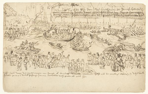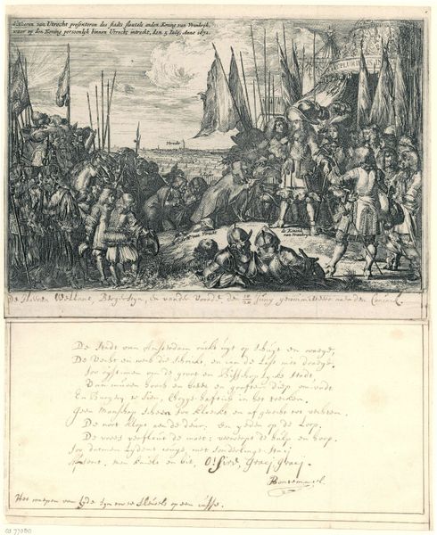 Curator: This is Sebastiaen Vrancx’s "Leaving Troy," made sometime between 1593 and 1647. It's a pencil and engraving print showcased at the Met. Editor: The scene feels very busy. A crowd of people are leaving the city and heading toward the ships in the harbor. What narratives do you see emerging from this piece? Curator: The most pressing aspect of this piece is the act of displacement. How might this scene echo or inform our understanding of contemporary forced migration? Editor: I hadn't considered that! With so many historical artworks, I often struggle to connect to them and see what lessons are in them. I was only looking at it formally! Curator: Vrancx captures a moment of immense vulnerability. This piece encourages us to confront our role as witnesses and potential actors within ongoing cycles of displacement and conflict. Is there something different in how you read this artwork now? Editor: Definitely. Thinking about displacement really reframes it. It's not just a historical scene but a commentary on the enduring human condition, particularly how vulnerable populations are affected by war. Thanks, this perspective changes everything! Curator: Art holds power when we activate it by thinking about the world around us. Keep engaging with art through this lens and your understanding will become only richer and more meaningful!