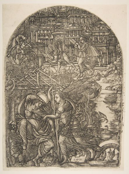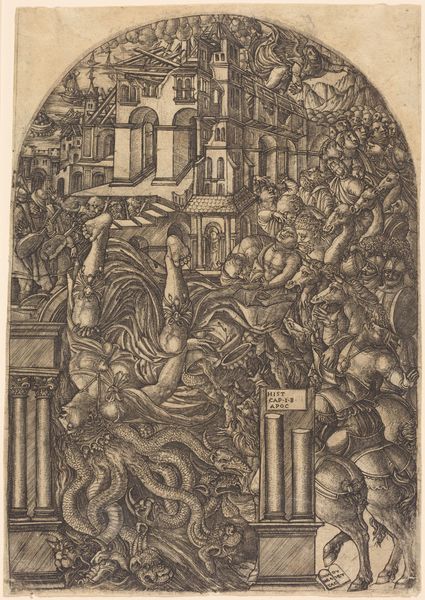 Editor: We're looking at "Satan Bound for a Thousand Years," an engraving by Jean Duvet, created sometime between 1546 and 1556. It's densely packed, the textures created by these tiny, swirling lines! What stands out to me is the division of the composition into distinct zones, almost like a graphic novel panel. How do you interpret this work? Curator: Indeed, the stratified composition is central to its visual impact. Notice how Duvet has segmented the space into earthly and celestial realms, yet united them through the forceful diagonal lines formed by the bodies of the angels and the swirling vortex of cloud. The use of line—the sheer quantity of it—is itself significant. It contributes to a sense of almost claustrophobic intensity. Consider also how the hatching both defines form and generates light and shadow. Do you perceive a particular emotional quality emerging from this interplay of line and form? Editor: Yes, definitely a sense of drama! The intense hatching does give it a very charged feel. Is there a specific way the arrangement adds to that emotional impact? Curator: Precisely. The compressed space contributes to the sense of divine struggle, and consider the poses: figures are in positions of constraint, being bound, falling. This compositional compression echoes the thematic restraint imposed upon Satan. It’s not merely about representation, but the orchestration of form to elicit a specific emotive and intellectual response. Look closely at how each individual figure and scene interlocks with another to push and pull at the borders of the artwork. The use of light and shade, as well as positive and negative space, has a clear direction. Do you see any implied triangles in this picture, as axes and fulcrums to which our eyes adhere? Editor: Yes! I see some subtle geometry between the angels' heads, guiding us from the top right corner to the bottom left. I never would have noticed that! Curator: Precisely! So it is not only the represented content, but the purely formal relations of lines and forms which deliver meaning. Editor: I can see how the composition directs our eyes, reflecting the overall sense of divine order imposed upon chaos! Thanks!