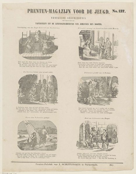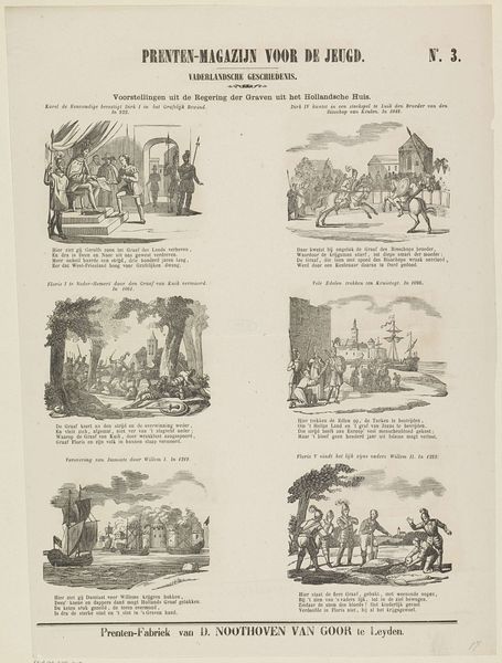 Editor: This print, "Tafereelen uit de geschiedenis van ons vaderland…" by Dirk Noothoven van Goor, probably made between 1850 and 1881, depicts scenes from Dutch history during the French occupation as engravings, almost like a storyboard. The detail is amazing, but I’m struggling to connect with it emotionally. How do you see the work functioning visually? Curator: It appears we have a print utilizing the technique of engraving to narrate a series of historical events, grouped symmetrically in boxes. What strikes me is the contrast of the scenes – the assembly, the embarkation and so on. Focus less on their historic value, and think about the internal structures, line quality and how these different formal values relate to each other in this piece. The artist seems primarily interested in composition to communicate the narrative. Notice how each little scene leads the viewer to the next one on the page. Editor: So, the artist cared about how the scenes were visually arranged more than the historical accuracy itself? Curator: I would say the compositional balance seems to dominate the presentation and perception. Are you interested in the perspective lines used in the outdoor scenes? Or in the geometry that controls the structure? Perhaps more study will enlighten us about those specific elements. Editor: I was drawn to the little stories. But seeing how the engravings are neatly organised emphasizes the visual relationships in the page design itself! Thanks. Curator: Indeed. Formally engaging, we can see this historical scene anew.