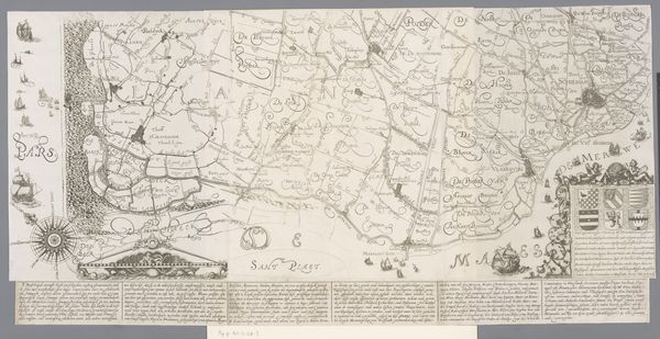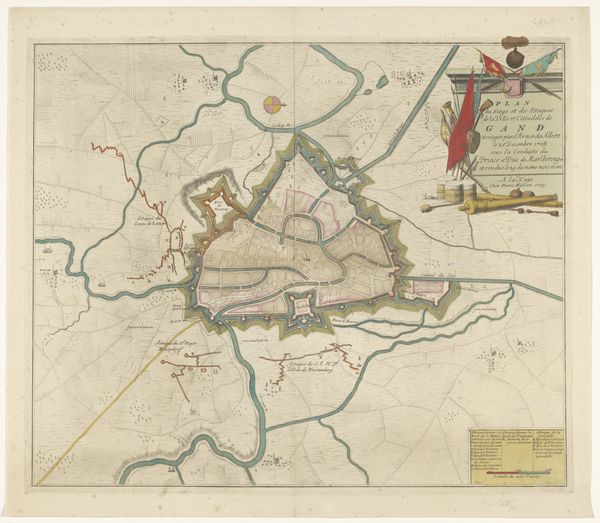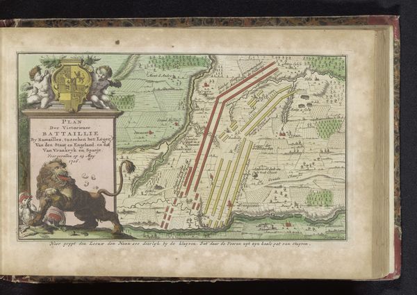 Curator: It is a watercolor from 1735 whose creator goes unnamed; it pictures the "Slag bij Denain, 1712". It seems the Battle of Denain. What jumps out to you? Editor: Well, at first glance, the use of color is quite striking. It almost neutralizes the violence one would expect from such a depiction. The pastel palette gives it a feeling of… distance, I suppose. It makes the historical event appear much more calculated. Curator: Exactly. The cool tones help remove the immediacy, emphasizing strategy. We're seeing not just a battle, but a visual distillation of power relations and imperial ambitions. The various symbols employed—flags, the lion—are deliberately composed. Each color chosen surely relates to faction, land, and, therefore, dominance. Editor: That’s a good point. But what I am also drawn to is how abstracted it is, how it almost looks like a map laid out rather than the lived brutality of a battle scene. What interests me here is how it seems more a technical drawing and, even further, how this drawing comes into being. The watercolor and colored pencil, chosen because they are inexpensive and easy to work, almost speak of an academic practice and, therefore, of the process of control. Curator: True. But remember the purpose. A patron commissioned it, not merely to record the materiality of battle but to solidify and display triumph. This "Battle of Denain," abstracted as it is, serves as a visual reminder of who holds the land. Look at the detailed inking within the lines—such labor! Editor: I see your point; all the same, one element I would love to learn more about is that use of cheap watercolor: why it looks the way it does and what were the means and the access to material at the time it was made? Curator: Interesting point, this colored symbolism, made from mundane materiality…! It challenges my expectations, definitely forces us to revisit these displays of power and victory with more questioning and scrutiny! Editor: Indeed, it all invites us to understand art not just as aesthetic value, but as objects of social and economical understanding, as cultural memory embedded in paint and color.