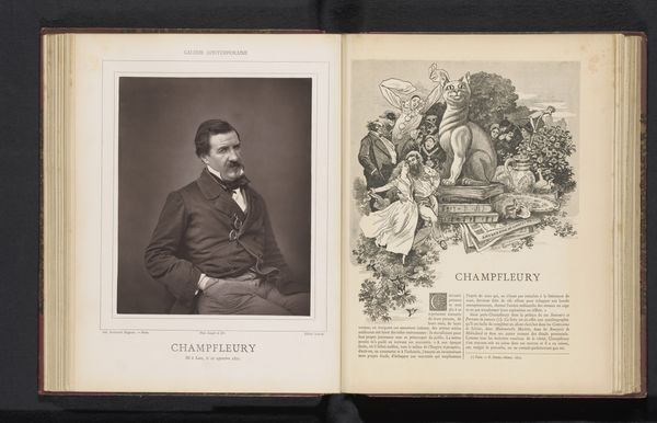 Curator: Before us, we have a portrait of Charles Monselet. It’s attributed to Etienne Carjat and we believe it was created before 1879. The medium is listed as albumen print. It resides here at the Rijksmuseum. Editor: He looks… rather pleased with himself, doesn't he? A certain twinkle in his eye, comfortable in his finery. I am intrigued by the albumen print, too. Can you tell me a bit more about it? Curator: Well, albumen prints, such as this one, were very common then. The process involved coating paper with egg white – the albumen – and then using that to bind the photographic chemicals. It was a relatively inexpensive way to reproduce images. But look closely, you can observe a fine level of detail given this method, from the man's vest to the subtle treatment of shadow on his face. Editor: Interesting how accessible photography had become and I’m intrigued by the subject too. Charles Monselet: was he a figure of note? Was he important in Parisian society? The pose is so self-assured. What was his role, his influence? Curator: Indeed. Monselet was a well-known writer and bon vivant, known for his wit and culinary writing. Carjat himself was more than a photographer. He was a caricaturist and journalist as well, deeply involved in the Parisian cultural scene. They ran in similar social circles. The photographic process becomes intrinsically connected to these cultural networks of the era. Editor: Absolutely, seeing these connections deepens our understanding of the period. The mass-produced photographic images gave access, while the artistic circles were producing celebrity within them. I notice an illustration paired with the portrait on the opposite page: poetry printed below! The whole feels curated and considered, not unlike how we approach digital access to art today! Curator: That is perceptive of you to note. How different mediums interact and represent the celebrity of Charles Monselet does open further areas for discussion! This is what art is really about - expanding our own perspectives by engaging in dialogue with objects such as this. Editor: Indeed. And through the materials, and their context, we see an ever clearer image of how art reflects and shapes its world. Thank you.