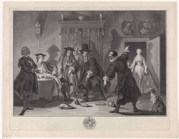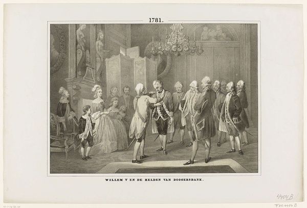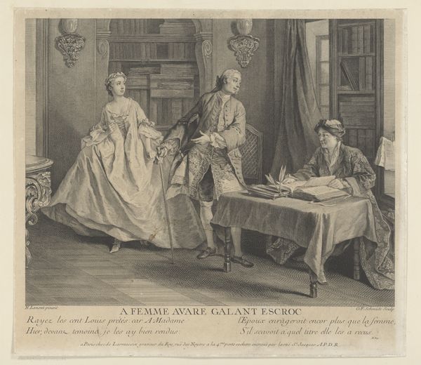 This is Henry Linton’s “Boucher présenté à Madame de Pompadour, from Le Monde Illustré.” Linton made this image as an engraving, a print-making technique that allows for fine detail and delicate shading. The composition is carefully structured, with the figures arranged to lead the viewer's eye through the scene. Note how the sweeping lines of the room's architecture contrast with the static arrangement of the figures. The artist uses a semiotic system of signs to communicate. For example, the costumes and interiors serve as cultural codes. They signify wealth, status, and historical context. Linton destabilizes traditional portraiture by capturing a fleeting moment of introduction. This challenges the idea of fixed representation. It engages with new ways of thinking about power, representation, and the gaze. Ultimately, it is the formal quality of Linton's graphic style that holds the key to understanding this work. Its sharp lines and tonal gradations are not merely decorative; they actively construct meaning.