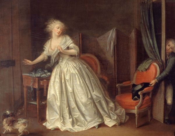 Editor: Here we have Jean-François de Troy’s “The Declaration of Love,” painted around 1724 using oil paints. The texture seems smooth and deliberate, yet the scene itself has this kind of nervous energy… a tension in the composition that strikes me. What's your perspective on this piece? Curator: The energy you perceive is, in my estimation, located within the contrasting textures and their dynamic arrangement across the canvas. Observe how the flowing drapery contrasts with the rigid architecture of the bed. Does the impasto technique, evident in the fabrics, not emphasize their material presence, thereby adding tension to the romantic encounter depicted? Editor: Absolutely. The folds and the ornate details are so pronounced, drawing my eyes around. Is this emphasis on form a common characteristic of paintings from this era? Curator: Indeed. The Rococo style, to which this painting belongs, emphasized asymmetry, grace, and delicate colors. Note the careful placement of the figures, offset to create imbalance but contained by the ornamental frame and the overhead painting; it almost imposes a pictorial structure, one might say a visual semiotics. What meaning can we ascribe to this seemingly deliberate imbalance? Editor: Maybe that reflects the uneasy feeling of the moment? A confession never sits squarely? Curator: Precisely! De Troy manipulates form to communicate narrative complexity. The diagonal lines, soft palette, and detailed brushwork function as visual cues, enriching our understanding beyond a literal reading of the declaration itself. It becomes an exercise in understanding not just what is said, but how it is presented. Editor: This formal analysis definitely shifts my understanding of the artist's intent and that period's aesthetic values. Curator: Agreed. Paying close attention to form unlocks deeper narrative and conceptual interpretations.