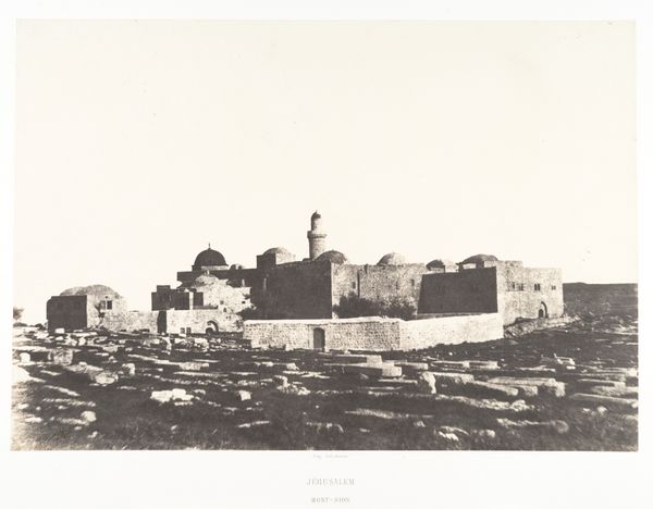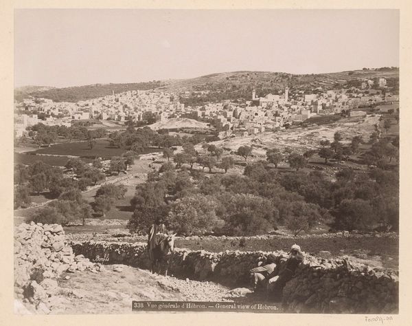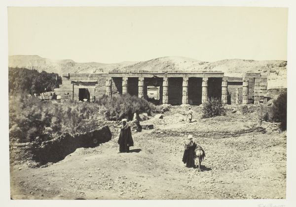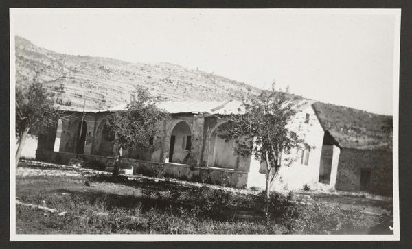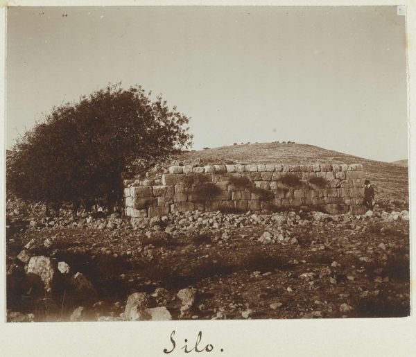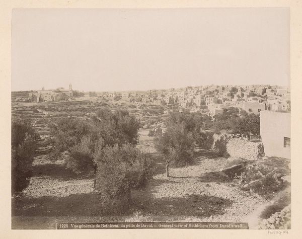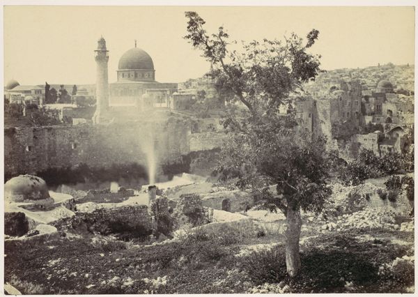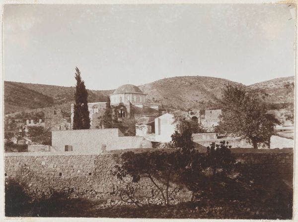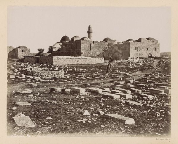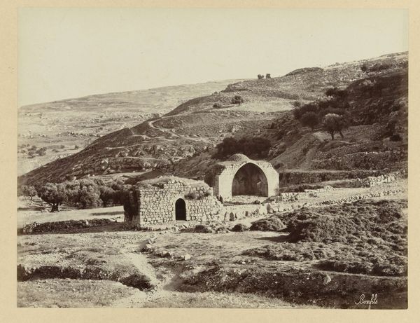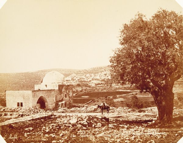 This photograph, "Grave of Rachel near Bethlehem," was created by Maison Bonfils. The light and shadow interplay across the dusty landscape, emphasizing the stark geometry of Rachel's tomb with its stark contrast to the organic forms of the surrounding trees. The image is structured around the tomb, which anchors the composition, framed by the natural elements that seem to both protect and isolate it. This interplay between the built environment and the natural world might reflect a deeper cultural narrative about settlement and wilderness, sacred space and the everyday. The photograph's tonal range, primarily in sepia, affects how we perceive depth and texture. The formal elements of the image, in their balance and tension, invite you to contemplate the ways that space, architecture, and landscape can create meaning. The composition suggests a reflection on the act of bearing witness, positioning the viewer as a distant observer of a landscape laden with historical and religious significance.