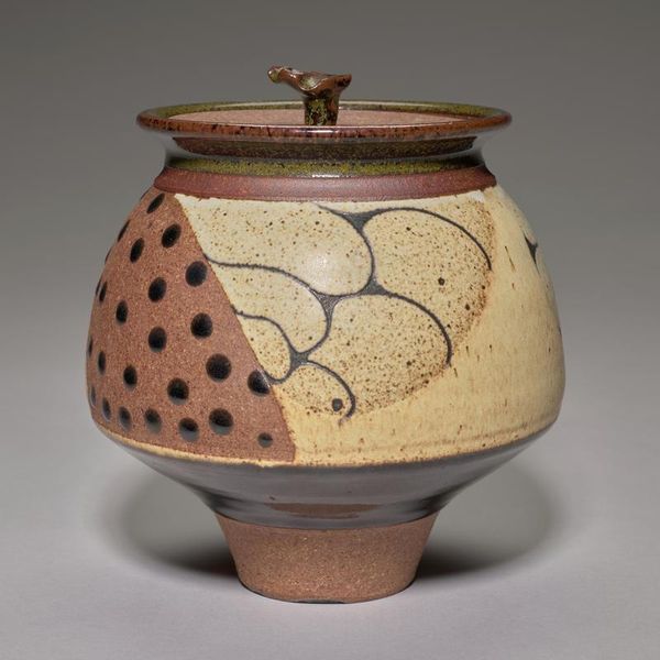Editor: This earthenware teapot, probably from the 20th century, features a wooden handle and some lovely earthy tones. It has a very handmade, rustic feel to it. How would you interpret this piece? Curator: Immediately, I'm drawn to the handle. The choice of woven wood over ceramic is fascinating. Consider what a handle represents: connection, accessibility. The wood, in its raw state, becomes a potent symbol. What feelings does it evoke for you? Editor: Well, it makes me think about nature and simpler times, perhaps. Less refined. Curator: Precisely. Now, consider the earthenware itself. The glaze, with its browns and muted colors, has an unrefined appearance. The brushstrokes create flame-like patterns; combined with a wood handle, doesn’t it speak to something elemental? Editor: I see what you mean. It makes you think about fire and earth… the basic elements? Curator: Indeed! And what does tea itself signify culturally? Warmth, comfort, community, conversation… A shared experience, often ritualized. This teapot, with its deliberate imperfections, enhances, rather than detracts, from that feeling. It merges ancient symbols and daily experience. Does that alter your first impression? Editor: Definitely. I had only focused on the “rustic” feel, but thinking about the deeper connections between materials and tea’s cultural role is very insightful. Curator: Pottery in itself also signifies earth and craft in many cultural narratives and myths. Editor: That’s something I hadn’t fully considered. I'll definitely view similar works with a new perspective.