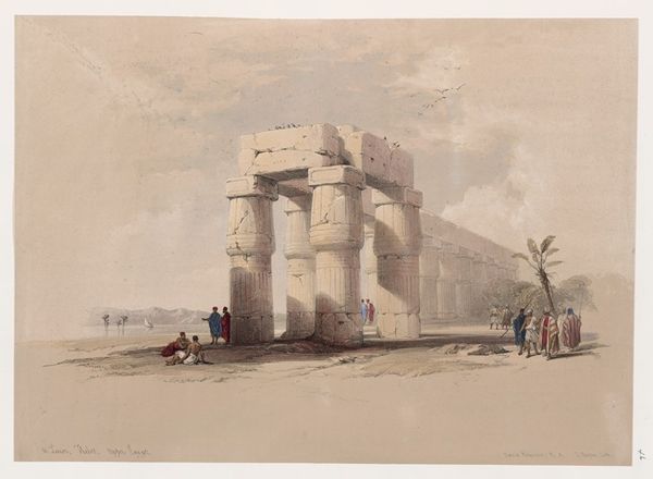 David Roberts created this watercolor, "One of the tombs of the caliphs, Cairo," using paper and pigments. In this period, watercolors were commonly used for travel sketches, a way of efficiently capturing scenes before the advent of photography. What I find fascinating here is how the artist approaches the depiction of building materials. The striped masonry is rendered with incredible precision, giving us a clear sense of the built environment. Look closely, and you’ll notice the artist has taken great care to depict the stone textures. The wear and variations in color are all carefully observed, and the whole drawing is structured with straight lines and planes. The medium of watercolor, often associated with spontaneity, is here employed with detailed precision to represent the enduring architecture. By giving us a palpable sense of the labor and skill required to raise these grand structures, Roberts invites us to consider the deep cultural history embedded in the very stones. The artist challenges the traditional hierarchy between fine art and the so-called "minor" arts like building and construction.
