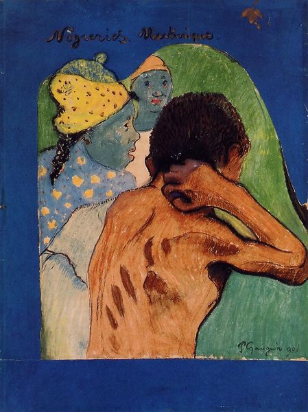 Curator: Looking at Paul Gauguin's "Two Women (Flowered Hair)" from 1902, now in a private collection, I'm struck by the dreamlike quality of the scene. It's suffused with a sense of languor. Editor: Immediately, my eye goes to that brilliant orange dog looking out the window, contrasting with the purplish background and the figure on horseback in the distance. It feels almost theatrical. Curator: Indeed, the dog is a striking detail. Considering Gauguin's time in Tahiti, the women themselves—their placement, their bare shoulders— speak volumes about exoticism and the European gaze upon Polynesian culture. Do the flowered hair ornaments evoke particular rites, customs, or even a signal of romantic availability? Editor: Right, it's critical to remember that this work isn't just an innocent portrayal. Gauguin's representations are tied to colonial power dynamics. We have to question how accurately they represent Tahitian life versus fulfilling European fantasies. What part of Gauguin's personal struggles can be detected here? It feels voyeuristic. Curator: The symbol of the dog might not be accidental: perhaps a guardian, a spirit animal or even something far more personal. Note that there is yet another ghostly figure in the frame...it looks more like an angel, doesn't it? The dream element here is reinforced by the flattened perspective, the vibrant hues of what appears to be oil paint, and the overall composition. How do we reconcile his artistic innovation with this complex legacy? Editor: It's a continual negotiation. By acknowledging the history and power dynamics involved in representing other cultures, while at the same time examining the role these works have in shaping narratives, that is our first step. The art market still values Gauguin immensely, and he certainly continues to stimulate much discussion on orientalism in modern art. Curator: Absolutely. By diving beneath the alluring surface, hopefully, we can find the emotional, cultural, and psychological undercurrents these images carried for Gauguin, and continue to carry today. Editor: Precisely. "Two Women (Flowered Hair)" compels us to engage critically, interrogating its place in art history and contemporary culture alike.