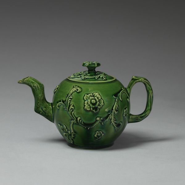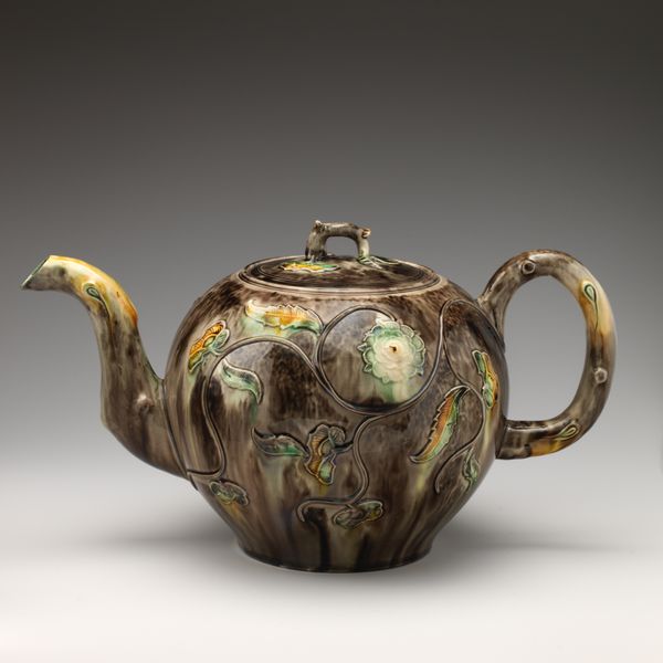 This charming Whieldon-type teapot resides at the Metropolitan Museum of Art in New York. The eye is immediately drawn to its rounded form and the fluid, organic motifs which enfold the teapot. The piece destabilizes traditional ceramic practices through its playful use of color and texture. The glaze is a dance of greens, yellows, and blues, and the mottled effect mimics natural landscapes. This aesthetic choice rejects the clean lines and uniform surfaces often associated with ceramics, inviting us to consider the object as a landscape onto itself. Notice the small sculptural dog resting on the lid. It transforms the teapot into a whimsical tableau. Ultimately, the teapot's formal qualities—its shape, color, and textured surface—operate beyond mere decoration. They invite reflection on how utilitarian objects can embody artistic expression and challenge established aesthetic norms. The piece encourages us to reinterpret the everyday, blurring the lines between art and function.