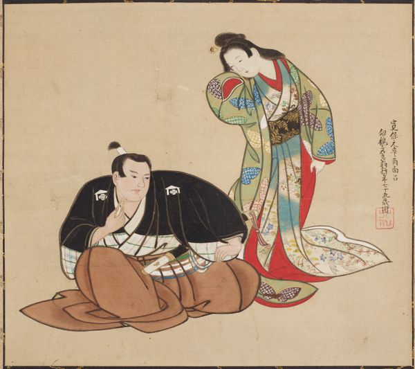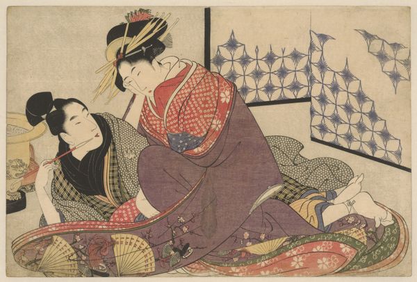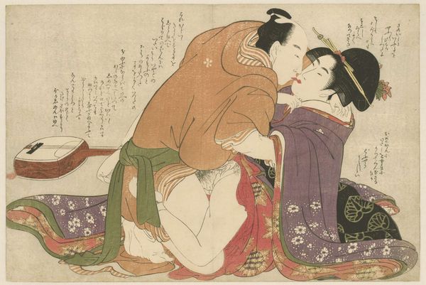 Curator: Here we have Kitagawa Utamaro's woodblock print, "Ouder getrouwd stel bedrijft de liefde," potentially dating from 1799. It’s currently held here at the Rijksmuseum. What’s your initial take on it? Editor: Well, besides the obvious subject matter, I'm struck by the textures. The way the soft paper contrasts with the almost aggressively graphic quality of the lines… and the dyes themselves. It looks like it uses vegetable dyes based on how muted some colours appear, but they have held their own after all this time. Curator: Indeed. Utamaro was a master of capturing everyday life in the Edo period, and ukiyo-e prints like these, though often associated with entertainment districts and the floating world, also offer us fascinating insights into social attitudes towards intimacy. Remember these prints were widely circulated among various social classes. Editor: The circulation is fascinating. How the piece shifts depending on who's holding it. Here we have a kind of low-craft format capturing intimate lives - and probably finding an eager market looking at social commentary from what might seem like a taboo position today. I want to zoom in and see those woodblock markings. Curator: Absolutely. There is a certain humour too. The facial expressions, slightly exaggerated proportions... These add a layer of caricature to the portrayal. The print isn’t just a depiction; it's a social commentary through a specific lens of erotic art in 18th-century Japan. Also, you notice, it gives an unusual, maybe unwelcome amount of natural detail? It seems less idealised, for example, than more conventional depictions of the female body that become dominant in subsequent art forms. Editor: And yet, so stylised at the same time. We see a careful rendering of fabric and patterns, but a complete disinterest in representing conventional proportion of both the sitters' bodies. Where is his waist! All elements speak to both the skilled process and its contemporary purpose of producing copies. Utamaro and his printers clearly expected heavy use. Curator: Considering this piece today, we gain a sense of the cultural shifts concerning public representations of private life and the normalization, at that period at least, of sexuality across different age groups, which makes this work very poignant. Editor: Yes, that is right. It's powerful to consider how it engages with mass production, artistic practice, intimacy, and, of course, circulation.