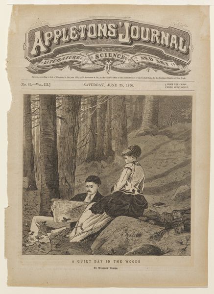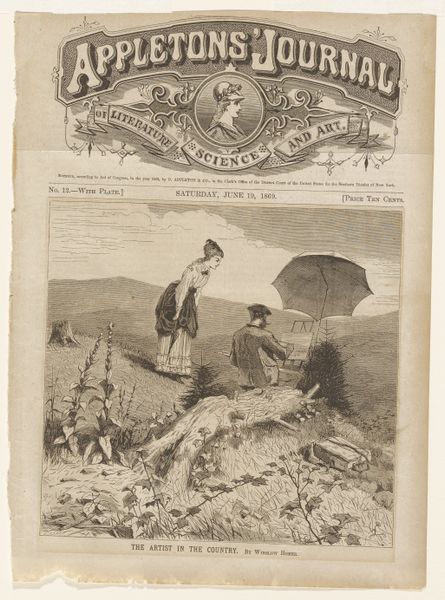 Curator: Winslow Homer's 1869 engraving, "The Artist in the Country," originally published in "Appleton's Journal," presents an intriguing interplay of observation and creation. Editor: It gives me such a peaceful feeling! I see that open landscape, the wildflowers. But it's more than just idyllic; there's this little bubble of creative intensity with the artist. Curator: Let's delve deeper into the structure. The composition invites us to observe a visual triangle, wherein the standing woman and the artist under an umbrella serve as key focal points within the space. Note the linear elements; Homer directs our gaze into the artwork using those lines. Editor: I see what you mean about the gaze. It's funny, though—the woman is looking at him and the artist at…well, the horizon I suppose? It's like a moment frozen, where she’s checking on the source of inspiration, seeing how her own field of view stacks up! Curator: A valid observation. Furthermore, in terms of semiotics, the umbrella can symbolize protection, even isolation of the artistic process. Its deliberate placement is indicative of Homer’s commentary on the space where art is created, seemingly. Editor: Exactly! And that feels right, doesn't it? Because creativity, real creation, is a fragile, solitary act in a way. It has to be protected and nurtured against the noise, against any interruption. Perhaps even against the artist’s muse, looking on from over their shoulder! Curator: The limited palette further enhances the visual impact. We witness a restrained tonal range—black and white providing a structural clarity while emphasizing texture and form in landscape. Editor: It feels immediate, as though someone captured a real moment – yet refined through his hand. It is just lovely; it really does make you want to be there, both watching and creating. Curator: Indeed, it encapsulates a distinct era's perspective on nature, art, and the individual. Thank you. Editor: Absolutely. A scene of serene, thoughtful creation. Thanks for guiding me!