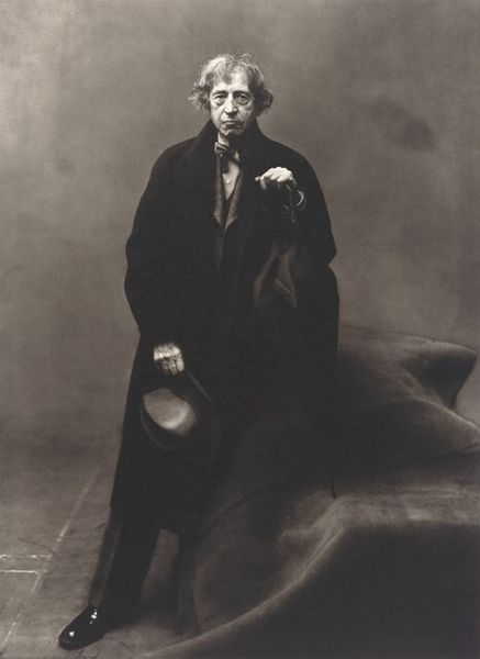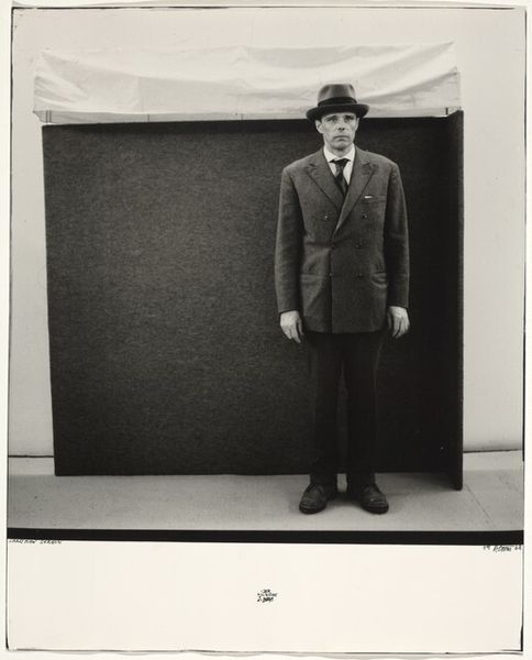 Curator: In front of us is Irving Penn's portrait of Marcel Duchamp, taken in New York in 1948. Editor: The immediate feeling is constraint, isn't it? The subject is quite literally cornered, giving the work a closed-in, almost claustrophobic mood despite its modernist qualities. Curator: Penn was a master of the photographic portrait, distilling his subjects to their essential essence. Positioning Duchamp within this tight corner is, I believe, about exploring the multifaceted layers within the iconic Dadaist's personality. There is vulnerability revealed here, as well as something confrontational in the pose. Editor: The way the grayscale tones fall across the surface creates distinct facets too, don't you think? The shadows accentuate the geometric enclosure, further locking him within the frame, within himself even. Semiotically, this suggests restriction or perhaps the constraints of being a celebrated artist. Curator: And that very concept might resonate with Duchamp's own artistic explorations, no? Think of the readymades, and how Duchamp confronted our definitions and expectations of what art can be. Here, it's as if Penn, through his composition, explores that same paradoxical tension between freedom and limitation. Perhaps the artist, boxed in. Editor: It certainly makes you question that smile, doesn't it? The slight upward turn of his lips amidst the stark lines—is it defiance or resignation? The low key lighting adds a layer of ambiguity, really. A portrait of controlled form with concealed psychological intent. Curator: Absolutely. We find symbols that mirror inner conflicts or contradictions within the cultural memory of an icon, the visual equivalent of wrestling with artistic legacies. The eye travels up along this angular, claustrophobic frame to fix on that wry expression as if to find clues. The portrait certainly sparks thought beyond the confines of the photographic frame. Editor: Penn really plays with geometry to make the psychological tension visually striking. It transcends simply capturing a likeness and starts interrogating something deeper. Curator: Yes, and this is a beautiful study in symbolism of spatial and psychological limitation within the vast career of an iconic artist. Editor: Precisely, and formally we've noticed how cleverly space and line combine, inviting multiple perspectives into the image, even beyond the immediate impression.