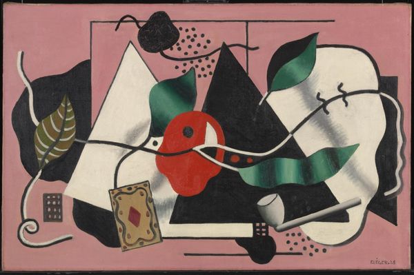 Curator: Look at this amazing piece! Ernst Wilhelm Nay's "Albaran," from 1951. Editor: My first thought? It's a constellation of subconscious anxieties, all sharp angles and watching eyes. Curator: The piece definitely pulls you in. As an abstract expressionist print, the geometric forms and varied color fields feel like a deliberate emotional language. It really exemplifies a post-war need for visual catharsis, don't you think? Editor: Absolutely. You feel Nay's grappling with the anxieties of his time through abstraction, but it feels intentional too. These aren't just chaotic brushstrokes but symbols wrestling with shadows. I notice these disembodied eyes that seem to be everywhere. There is always somebody watching you and perhaps something that needs to be seen. I love how it incorporates these little playful pop art dots at the end of thin lines, a hint of levity. But there is this sense of always being surveilled, it's inescapable in the composition. Curator: Yes, and note the brown tones paired with softer blues and greens, creates such an earthy yet unsettling harmony, doesn't it? Also, the overlapping planes feel like the layering of memory and emotion. Is Nay trying to process Germany's complex emotions after the war, these colors seem to communicate some underlying emotional conflict. Editor: Definitely, but let’s not just look at the artist. Post-war, the masses were still suffering from psychological damages while being gaslighted with national narratives of “moving on.” So I can only imagine these hard sharp shapes represented a social dissatisfaction being artistically created to give shape and therefore voice to societal anxiety. It truly sits within you once you reflect on these layers of shapes, color and cultural moments. Curator: Indeed. I see this too, and "Albaran" has now settled even deeper within me, thank you. Editor: Art finds itself living, once it has lived through us.