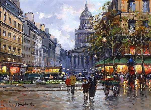 Curator: Antoine Blanchard’s painting, titled "Place du Luxembourg le Pantheon", presents a bustling Parisian street scene rendered with oil on canvas. The composition draws the eye towards the Pantheon in the distance, anchoring the cityscape. Editor: It strikes me immediately as a picture about mood—wet, cool, and hinting at a deeper sense of melancholy in its greyscale treatment, which is amplified by small hints of warm accents. Curator: Precisely. Blanchard painted numerous Parisian scenes, and they invite discussions about class and modernity. Observe how the figures in the foreground, likely bourgeois citizens, are presented. Consider the cultural context of Paris during this era, a society still grappling with rigid class structures despite its burgeoning modernity. The Pantheon itself serves as a symbol, initially a church, then a secular temple dedicated to revolutionary ideals and national heroes, reflecting complex power dynamics. Editor: Agreed, there is definitely tension in this portrayal! Shifting away from iconology, I notice that the brushstrokes are quite broken and fragmented, contributing to a hazy, almost dreamlike atmosphere. I find that intriguing, considering how it softens what could be interpreted as social realism and brings into sharp contrast its academic structure and subject. The way he models space, with such atmospheric diminution, reminds me a bit of Turner. Curator: I think your reading really points to Blanchard’s talent for synthesis, right? He is operating at a nexus of modernism and academic convention. Now look at the clothing and body language of the figures. What can these small details convey about gender roles? Do we sense any critique? Do we sense aspiration? I find the subtle suggestion of an emerging middle class to be an important dimension of these scenes, captured beautifully by the impasto technique used here. Editor: The textures really animate the street, almost like a shallow relief. But if we push it further in the comparison to Turner or the Impressionists, one recognizes that this work flattens space to make a stage on which all his characters come alive as if by their own light. Overall, I’m struck how it brings all these elements—surface, theme, perspective—into a tense kind of harmony. Curator: So, what seemed at first like a traditional cityscape ends up becoming a painting about the transformation of Parisian identity, revealing some very fine, artful moments! Editor: Indeed. A lovely exploration of light and form reflecting and refracting history.