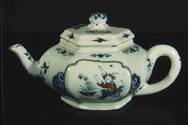 This porcelain teapot was crafted by Ott and Brewer in the late 19th century, around 1871-1893. Its gilded details and stark white body evoke a sense of refined elegance, echoing motifs found in neoclassical designs. The teapot's fluted body and decorative feet remind us of ancient Greek and Roman architectural elements. These motifs, symbols of stability and order, were revived during the Renaissance and have resurfaced repeatedly in Western art. Notice how the golden handle sweeps upward in a perfect semi-circle. Circular motifs and forms are common through art history. The simple act of sharing tea is steeped in history, signifying hospitality and connection. These ritualized gestures, deeply embedded in our collective memory, continue to resonate, linking us to the past. This seemingly simple teapot, therefore, becomes a vessel not only for tea but also for history.