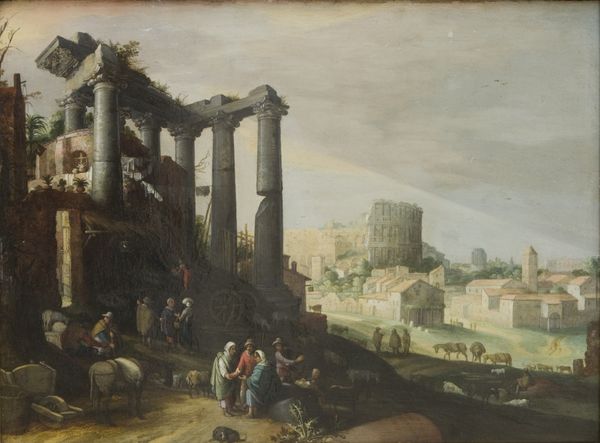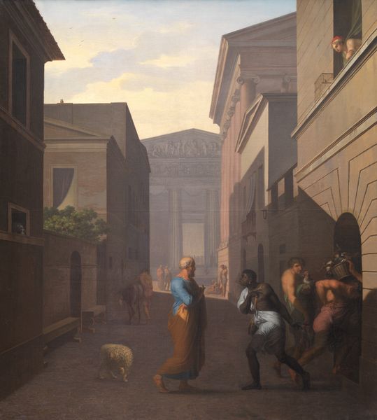 L.A. Schou’s painting presents a scene of labor against the backdrop of classical Roman architecture. The subdued palette and textured surfaces create a palpable sense of history and human endeavor. Structurally, the composition is organized around the imposing Arch of Titus, which frames the distant Colosseum. This architectural framing device highlights a dichotomy: the grandeur of Rome’s past and the daily activities of its present inhabitants. Notice how the artist uses the arch not just as a historical marker but as a structural element that separates and connects different layers of time. The dark mass of the statue being transported and the laborers contrasts sharply with the lighter tones of the ancient monuments, emphasizing the continuous, if strenuous, effort required to maintain a connection with the past. This contrast invites us to consider how societies engage with their history. The painting thus becomes a meditation on time, labor, and the enduring presence of history in everyday life.