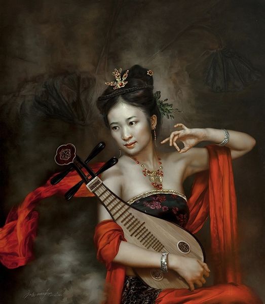 Michael Cheval made this painting, Intro Allegretto, and it’s a trip, right? Look at how he blends this surreal figure with these almost dream-like, watery landscapes. It’s like a stage set, waiting for a performance that's just about to begin. The texture here is so intriguing, isn't it? The way Cheval renders the fabric of the gown and the sheen on the cello; there's a real sense of layering, almost like glazing. And the colours! That juxtaposition of the warm reds and golds against the cool blues and greens creates this incredible tension. Take a peek at the bottom right. See those rocks? They look like small, individual strokes, building up to create depth. It all makes you think about how artists, even when painting something as seemingly straightforward as a portrait, are really playing with perception and narrative. I'm reminded of Magritte, but with a touch of theatre. It's like Cheval is inviting us into his own little world. A world that's open to interpretation and full of mystery.