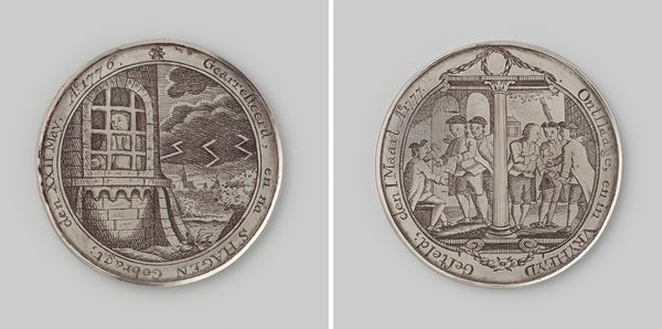 Curator: What a fascinating object. This is a Northern Renaissance engraving by Paulus van Wtewael, dating back to 1588. It's entitled "Aansporing tot eendracht," which translates to "Incentive to Unity." Editor: My first impression is one of duality, even conflict. The two sides present starkly different realities. There's a laboriousness evident on one face of what appears to be a metal token and what I presume might be an ideal image. The other appears a flooded town that doesn’t look very ideal at all. Curator: Precisely! The artwork offers a dual narrative typical of the time. One side displays an agricultural scene of oxen plowing a field—a representation of labor, perhaps even an idealized past and prosperity through traditional work and life. Editor: I can see that labor, yes. The detail on those oxen and the texture of the earth are remarkably rendered, especially given the constraints of engraving metal. But what strikes me is the physical process of creating this image—the artisan’s labor, the value embedded in the materials, especially metal, being circulated like the message it bears. Was the metal precious? How would the making of this token contribute to that idea of unity? Curator: That’s an excellent point. Tokens like these circulated, serving a propagandistic purpose during times of conflict, and as collectables thereafter. Consider the turbulent political landscape of the late 16th century, specifically the Dutch Revolt. This piece isn't merely decorative. It reflects a call for solidarity within the fractured Netherlands against Spanish rule. The materials here facilitate a portable, reproducible message to be spread across geographical divides. Editor: And the other side speaks to that discord? A flooded cityscape? It appears to be overwhelmed. Is that division by outside forces, or does the flooding speak to a fracturing from within, society as a whole succumbing to destructive forces? Curator: Likely a visual metaphor. A flood could represent internal strife and discord as much as a natural disaster. Given the title and the historical context, I'd say the flood alludes to the dangers of disunity. It highlights what might happen when different parts of the society don't act in unison. This sort of messaging of togetherness also extends to shared markets and collective work like on the first half of the token. Editor: The level of detail in capturing that vulnerability—the overwhelmed city in comparison to the industrious land reminds me how artworks like this reflect not only cultural but also social labor that seeks out the means to present certain views as natural or superior. Curator: Yes. The pairing creates a strong message when distributed among the populace. The unity advocated for on one side is shown in stark contrast to the societal collapse should people or industries divide on the other, even centuries after its creation. It serves as a stark visual commentary. Editor: Well, examining the interplay between material production and historical messaging has given me a new appreciation for this coin’s message as a call for stability and what costs social disunity. Curator: And for me, it highlights how artifacts like this served as powerful political tools shaping perceptions and encouraging a collective identity during the Renaissance, reminding us of the enduring relevance of art within socio-political movements.