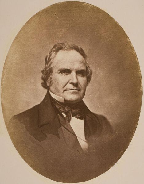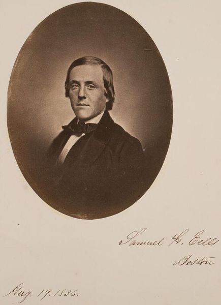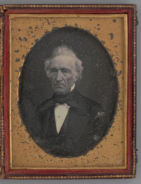 Curator: This is a gelatin silver print portrait of Captain Gideon Lane, circa 1855, attributed to Hamilton Campbell. What's your initial impression? Editor: The overwhelming darkness is what strikes me first. It has a sombre and imposing presence; you sense power, but perhaps tinged with weariness. Curator: Absolutely. Considering it's a photographic portrait from the mid-19th century, that somber quality might be linked to photographic techniques and their relationship to social hierarchies. Campbell was likely working within conventions about portraying social stature through serious facial expressions, costume and light to assert authority, class and gender for the Captain. The flowers might hint at the power relations as a man receiving this honor. Editor: The question of agency, doesn't it? Was Lane seeking that portrayal or was it determined by photographic norms and cultural ideals surrounding masculinity? What does this say about representation and construction of the ideal male image in that period? Curator: Precisely. The visual conventions served as social technologies shaping selfhood and influencing viewers' perceptions. Also, look at the framing - the elaborate gold and the ornate oval format contributes to an aesthetic meant for the elite. Campbell's choice is never neutral. It situates Captain Lane firmly in the powerful segment of 19th century society. Editor: It raises questions about access and the role photography played in consolidating and perpetuating these social divisions. This image then goes beyond representing just one man; it's an archive of Victorian values and class awareness. Curator: And by deconstructing these embedded ideologies, we enable audiences to reflect upon the evolution of power and representation, past and present. Editor: It allows us to investigate photography as a means to re-examine the politics embedded in the production of such portraits. Thank you! Curator: Thank you. It enriches our engagement when considering who controls these powerful images and whose stories are being told.