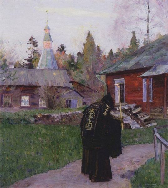 Konstantin Alexeevich Korovin created this oil painting, "Barn," with a composition dominated by a large, wooden structure offset to the left, evoking a sense of rustic solidity. Notice how the thick brushstrokes and earthy tones create a tactile, almost sculptural quality. Korovin plays with the tension between representation and abstraction. The barn is rendered with enough detail to be recognizable, but the looseness of the brushwork and the blurred edges push the image toward pure form. The figures in the foreground are secondary in composition, depicted with a similar lack of precise detail, as the artist focuses more on the interplay of color and light across the entire canvas. The muted palette, punctuated by the bright red of a figure's dress, emphasizes the materiality of paint itself, inviting a contemplation on the formal elements rather than a narrative reading. The artwork functions as a commentary on the very act of seeing and representing, highlighting the subjective nature of perception.