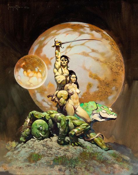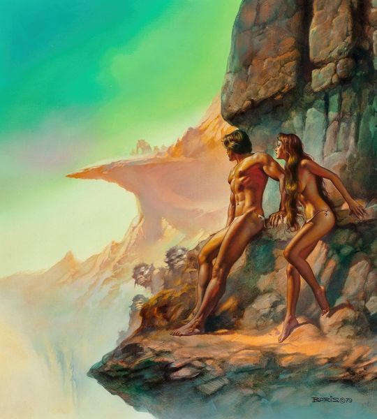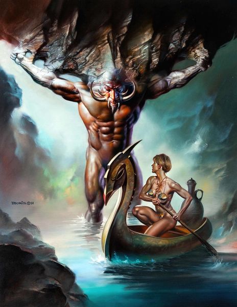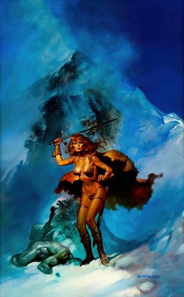 Editor: So, this is "Deathstalker IV" by Boris Vallejo, created in 1991 using acrylic paint. It feels intensely dramatic. Like, a total "fight or flight" moment. What do you make of it? Curator: A splash of pulp and passion, isn’t it? It hits you like a cymbal crash. Forget polite restraint, this is pure, unadulterated adrenaline rendered in acrylic. Look at the dynamism! The way the figures surge forward, all muscle and metallic gleam, poised on that precipice of light. Do you feel the energy radiating outward? Editor: Absolutely! There's so much happening, so much…skin. What’s with all the barely-there outfits? Curator: Aha! Well, beyond the obvious…aesthetic choices...consider the history. Vallejo made a name for himself illustrating paperback covers in the 70s and 80s - fantasy, sci-fi, the kinds of books you hid under your desk in high school. So, we are firmly planted in escapism, right? The hyper-muscularity, the scant clothing…it’s all part of a world where raw power and primal instinct rule. Like a fever dream set to canvas! And that raw edge somehow becomes almost primal! Don't you think? Editor: That makes sense. It’s over the top in a way that’s very deliberate. Knowing the context helps. I kept thinking it looked like a scene from a heavy metal album cover. Curator: Exactly! That's spot on! Vallejo created works for heavy metal bands, he was prolific. So it all circles back, a vibrant, visually stunning expression of primal desires and fantasy realms, dipped in the shiny lacquer of pulp sensibilities. Editor: Well, that was enlightening. I feel like I can see past the surface now. Curator: Indeed, art sometimes winks mischievously. Now you're in on the secret, though! And armed with that, how differently might you look at any art form?