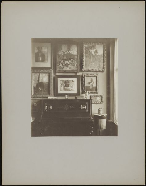 Editor: This gelatin silver print, "Interieur van Stadhouderskade 56, het woonhuis van Andries Bonger in Amsterdam" by W.J.G. van Meurs, dated 1904, has an incredibly warm feel to it. It's so rich in texture and detail. What catches your eye when you look at this photograph? Curator: Well, I’m immediately drawn to the materials depicted and, by extension, their means of acquisition and implications about labor and the society depicted. Look at the rug: its intricate patterns speak to particular weaving traditions. I am keen to know more about its construction and origin. Do these tell us something about Bonger’s class, or perhaps his taste for international goods made by invisible labour? And what can we make of all those framed photographs? Editor: That’s an interesting angle. I was thinking more about the arrangement and composition, how they speak to turn-of-the-century Dutch sensibilities, but now I am considering the cultural significance embedded in the production of objects. The means of the photographer also interest me. How easily available was this equipment, these chemicals and how does this gelatin silver print situate photography at the fine art / documentary crossroads? Curator: Exactly. Photography itself as a material practice, accessible to some but not others, shapes what we see and how we interpret it. This view into someone’s home confronts notions of accessibility and labor in producing images. What implications did increased availability of photographic techniques have for working artists who labored on paintings or illustrations to make a living? Editor: I never really considered photography this way, it opens new directions to think about production, not just of art, but also social inequality. Thanks! Curator: My pleasure. Looking closely at materiality truly unlocks many hidden stories about consumption and how society functions.