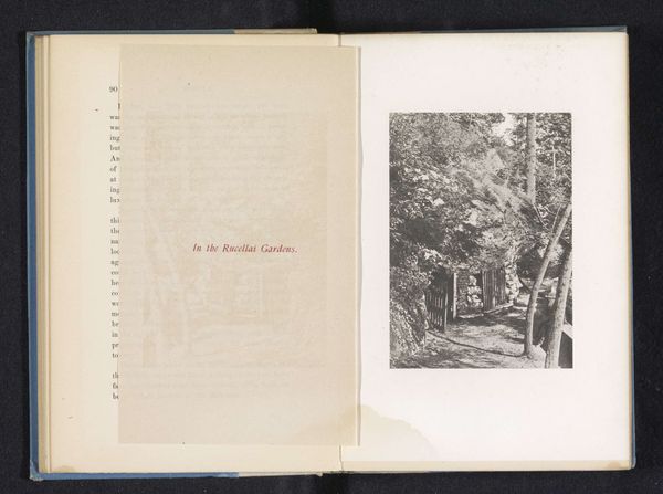 Editor: This gelatin-silver print, "Gezicht op een weg met bomen in New England," by an anonymous photographer, was created before 1890. It feels like a snapshot of serenity, a quiet country road disappearing into the shadows of the trees. What sort of visual language is at play here, do you think? Curator: Indeed. Look at how the road itself serves as a visual symbol. Roads often represent journeys, life paths, or even the transition between the known and the unknown. In this image, the receding road can symbolize a path into the future or a nostalgic yearning for a simpler time. The overhanging trees contribute too; in folklore, trees are often guardians of sacred spaces. Editor: That’s interesting. I was just seeing trees as pretty, shady things. Curator: But notice how they frame the road, almost like a protective archway? The dappled light and shadow cast on the road creates a sense of mystery, hinting at secrets and unseen possibilities. Consider what these symbolic elements communicated to viewers during that era and even now. It almost creates an idyllic dreamscape. Does this resonate with the paired page? Editor: Yes, with the text on the left, the scene becomes dream-like, less 'real.' It's more of a feeling. This has shifted my understanding - now it makes sense. Curator: Precisely! It all intertwines to form meaning. These subtle visual cues evoke an enduring human fascination with nature's transformative power and our own journey through life. The symbology transforms the image into an intimate reflection. Editor: I’ll never look at a road the same way again. Thank you! Curator: You're welcome! Understanding visual language is like learning the alphabet of the soul; it enhances our literacy of all things.