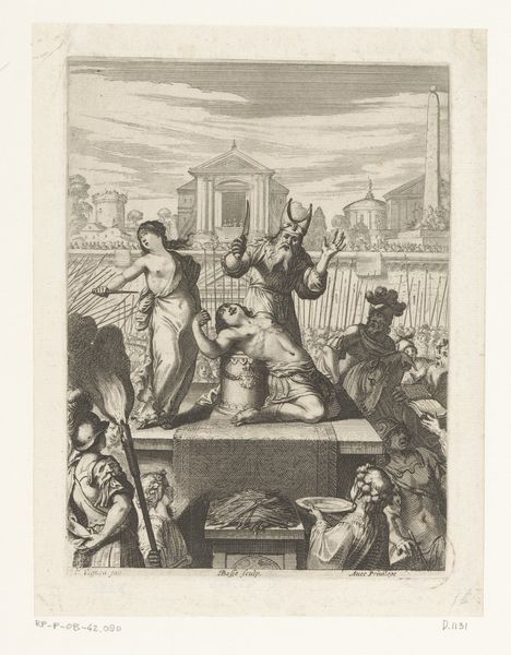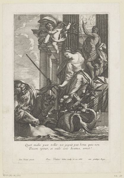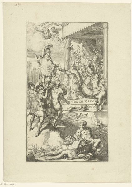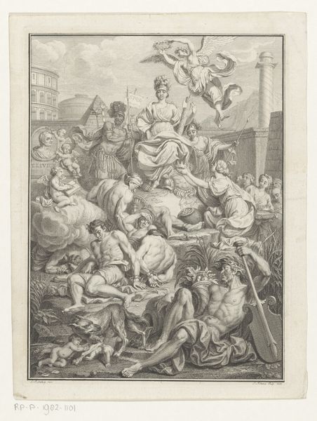 Editor: This is "Friedrich Wilhelm gelauwerd en ge\u00eberd," an engraving by Daniel Nikolaus Chodowiecki, created in 1782. It's quite busy; a scene unfolds with many figures, including winged allegorical ones, surrounding a central royal figure. There's a definite Rococo flair, and I’m curious about the message it’s trying to convey. How do you interpret this work? Curator: Well, it is interesting to examine this image through the lens of public image construction. Look at the scene depicted; an idealised monarch amidst allegorical figures. Who is the intended audience here, and what message is Chodowiecki attempting to disseminate on behalf of the depicted royal subject, Friedrich Wilhelm? Editor: The intended audience probably consisted of wealthy merchants or nobility of the time. The engraving perhaps suggests Friedrich Wilhelm's importance. Is there a political message that an engraving might communicate, compared to, say, a painting during this period? Curator: Absolutely. Engravings were easily reproducible. Therefore, prints had a wider circulation among various social strata. So the artist and patron likely wanted to associate Wilhelm with the classical motifs of laurel wreaths and prosperity to legitimise the existing social order. What is also important to note is how the print itself functions as a symbolic carrier of power. Do you think this portrayal accurately reflected the social and political reality of the time, or does it promote a more propagandistic viewpoint? Editor: I suppose it is a carefully constructed image to create a certain impression rather than presenting a factual record. Considering what you've highlighted, it suggests that the Rococo style was not purely decorative; in this instance it actively contributed to constructing a historical narrative. Curator: Precisely. Analyzing it in this light unveils how seemingly ornamental aesthetics played a significant role in shaping public perceptions of power and authority in 18th-century society. I find the cultural agenda of image creation to be an on-going dynamic that echoes across eras. Editor: It's certainly made me think differently about how images operate within broader social structures.