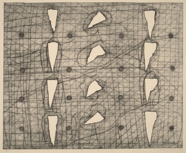 Curator: This is Naum Gabo’s "Opus 10," part of the Tate Collections. I'm immediately struck by the use of geometric forms. Editor: I'm getting a somewhat sepia-toned, vintage feel from it. The shapes seem to be layered, almost suspended. Curator: Gabo, deeply involved in Constructivism, sought to express modern industrial society through art. His brother even coined the term “Constructivism.” Editor: The intersection of these shapes, the positive and negative space, it feels like it's questioning solid forms and their relation to the world around them. Curator: Absolutely. Gabo rejected the traditional mass of sculpture, aiming for transparency and dynamism, mirroring the rapidly changing world. Editor: Thinking about that historical moment, with the rise of industry and revolutionary ideas, this work becomes even more poignant as a challenge to the status quo. What do you think, does it still resonate today? Curator: It remains relevant as a testament to art's ability to reflect and even shape societal shifts. It's a powerful visual articulation of progress and change. Editor: I agree. It makes you think about how the shapes in our own lives intersect.