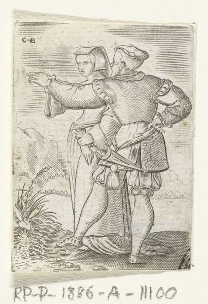 Pieter Maes made this engraving of a soldier with sword and shield, from behind, sometime in the 16th century in the Netherlands. We see a soldier standing on a small cliff, towering over a battlefield, with a sword and shield. In the background, other soldiers seem to be either in pursuit or retreat. The soldier's dress is extravagant, the opposite of practical, which speaks to the culture of militarism in Europe at this time, when the aristocratic class dominated military leadership. The artist may be commenting on the absurdity of war, or he may be simply depicting the social reality of military structure at the time. The caption below the image speaks to the importance of war. The context of this image can be researched through an understanding of the role of the military in 16th-century Dutch society and by examining the history of military dress.